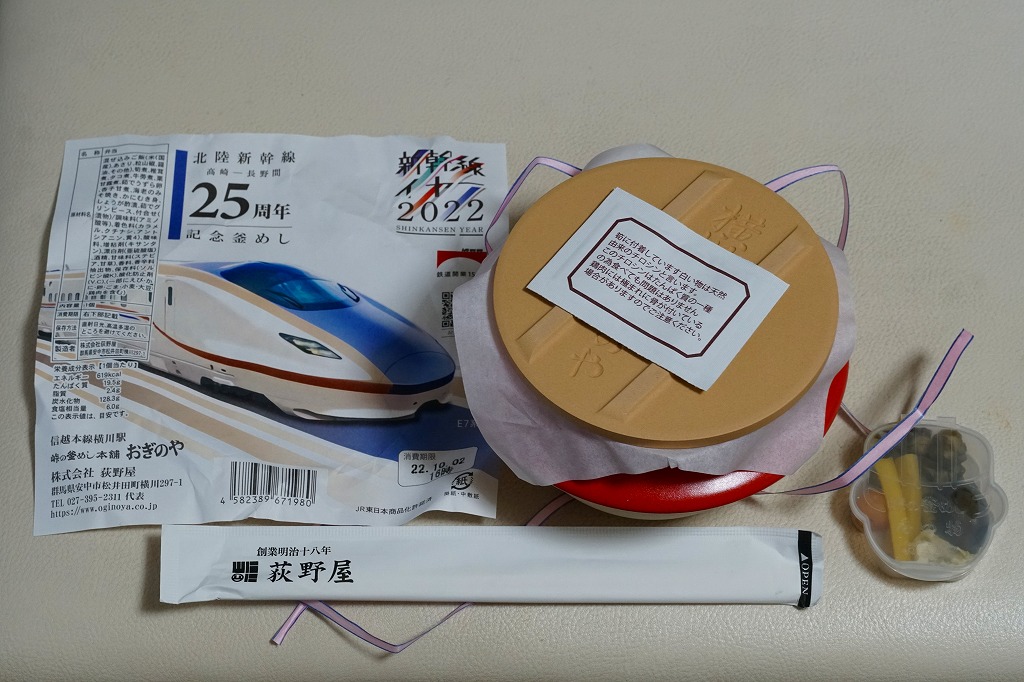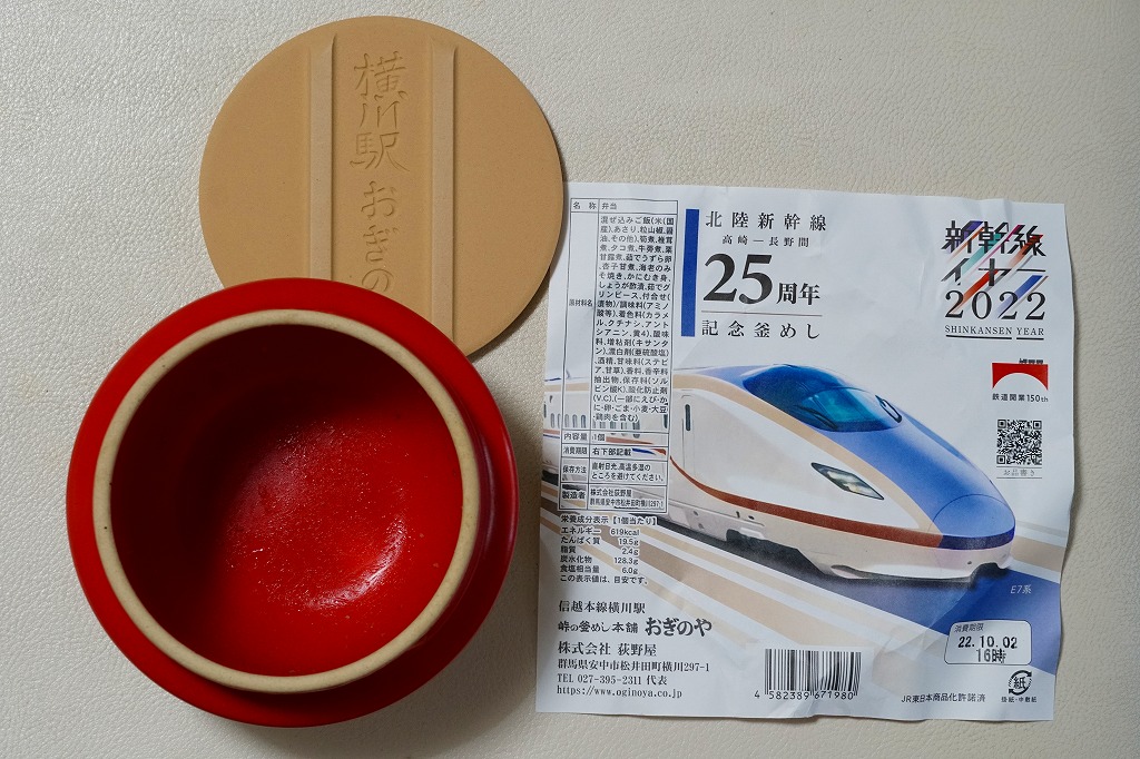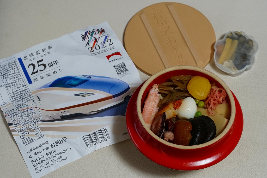 2022(令和4)年10月1日に、高崎駅と東京駅と軽井沢駅で発売、12月31日まで販売。掛紙にあるとおり、北陸新幹線の高崎−長野間の開業25周年を記念した駅弁で、発売日からのJR東日本の駅弁キャンペーン「駅弁味の陣2022」にエントリー。横川駅の名物駅弁「峠の釜めし」と同じ、益子焼の容器に正方形の掛紙をかけて、漬け物のプラ容器を添えて、ひもで十字にしばるスタイル。容器は赤みがかり、掛紙には現在の北陸新幹線電車のイラストを使う。