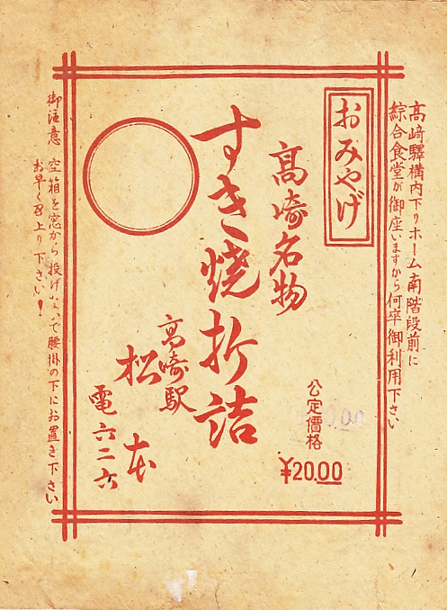 1940年代後半、昭和20年代前半のものと思われる、昔の高崎駅弁の掛紙。20円の公定価格を訂正した形跡がみえる。戦後の混乱期に売られたのだろうこの「すき焼折詰」とは、どんな駅弁だったのか気になる。