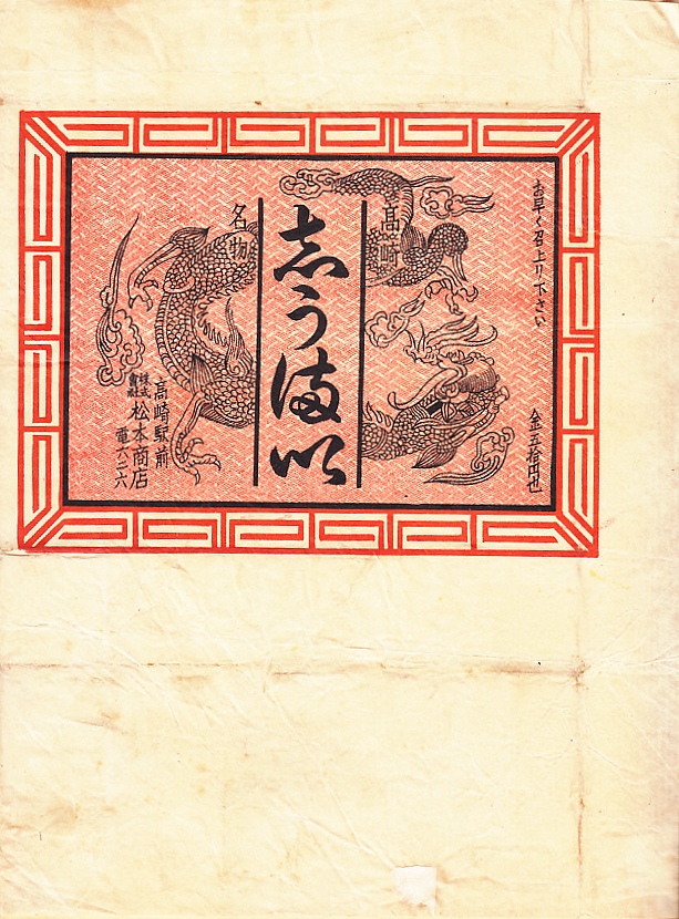1950年代頃、昭和30年前後のものと思われる、昔の高崎駅弁の掛紙。1958(昭和33)年10月に合併し高崎弁当となる前の、松本商店のもの。赤地に竜を描く、横浜駅で有名なシウマイの掛紙とよく似た絵柄。この頃には崎陽軒の名声が全国に知られただろうから、駅弁屋が焼売を模倣してもおかしくない。高崎駅のしうまいは、いつまで売られたのだろうか。