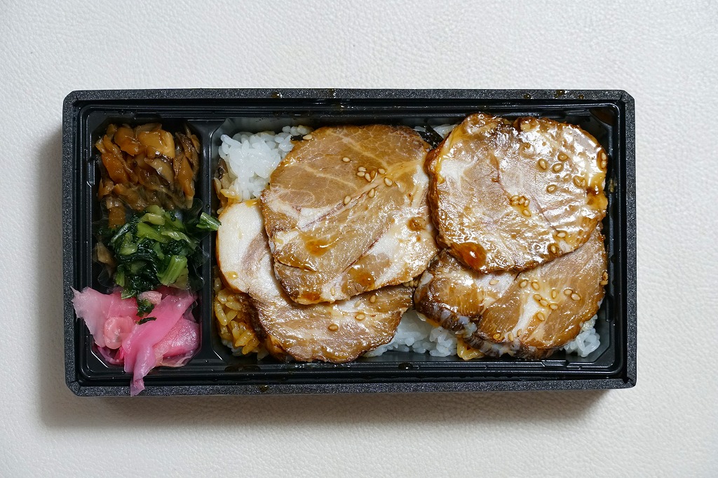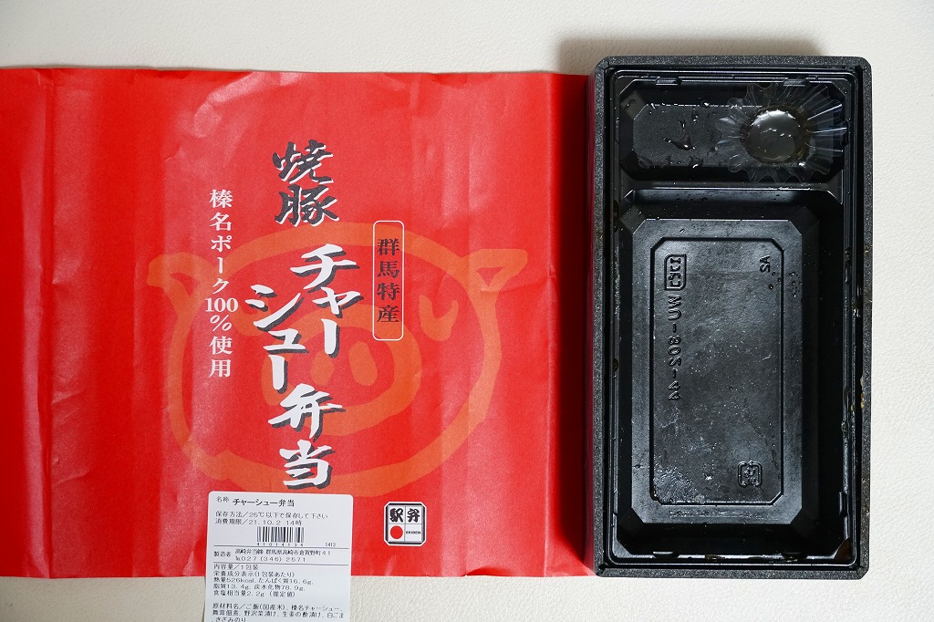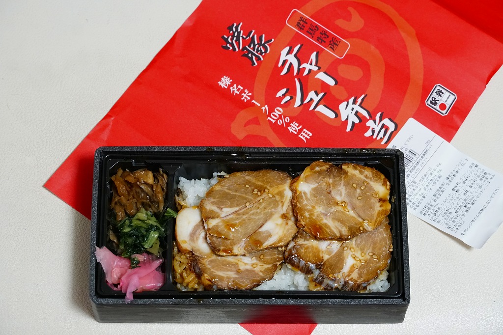 2003(平成15)年8月に発売。長方形の容器に白飯を詰め、榛名ポーク100%使用をうたう焼豚チャーシューで覆い、マイタケ佃煮、野沢菜漬け、甘酢生姜を添える。つまり豚丼で、駅弁ではあまり見られないチャーシュー弁当。肉の風味が独特で、お肉の駅弁らしからぬ淡泊な味のチャーシューが、輸入物ピーナツバターのようにすっと舌に溶けていく。価格は2003年の発売時で800円、2015年時点で900円、以後はこの常温版はしばらく売られなかったようで、2021年の購入時で1,000円、のちに1,200円、2024年10月から1,300円。