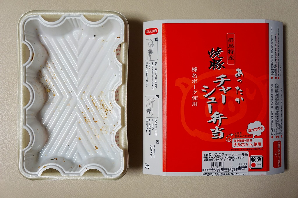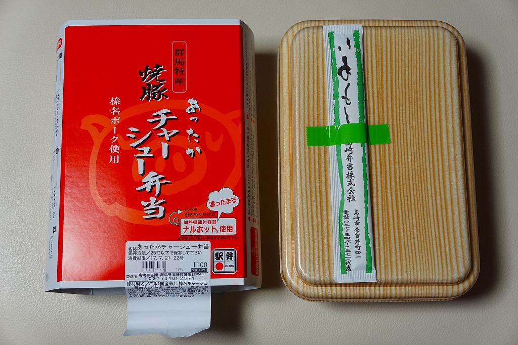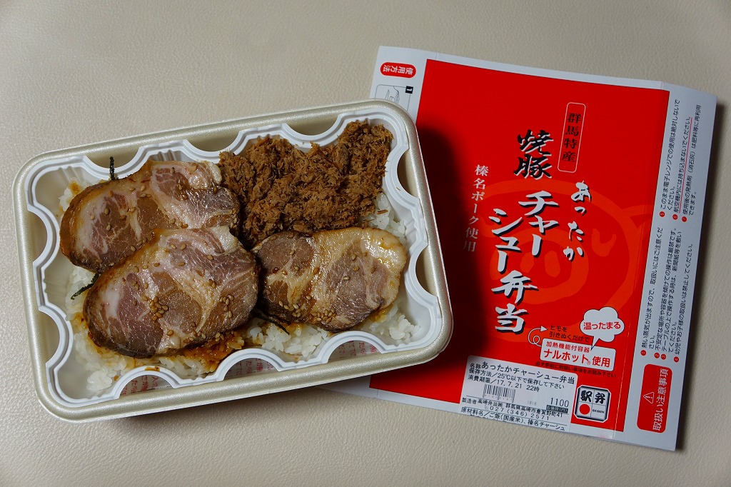 上記の駅弁「焼豚チャーシュー弁当」の、加熱機能付き容器入りバージョンで、2015(平成27)年までに発売か。長方形の容器に白御飯を敷き、たれをかけ、榛名ポークの焼豚チャーシューを3枚と豚そぼろだけで覆うという、潔い中身。こちらのチャーシューは上記のピーナツバター味でなく、高価なラーメンに載せているような、とてもトロトロなもの。一方で味付けが薄いので、ラーメンでなく弁当を食べている雰囲気であった。価格は2017年の購入時で1,100円、2019年2月から1,250円、2020年時点で1,280円。2021年までの販売か。