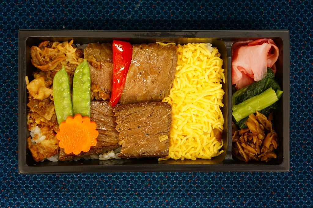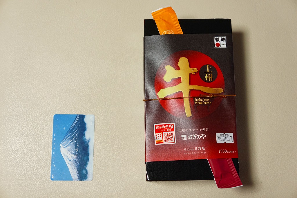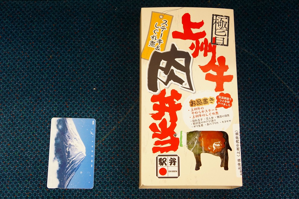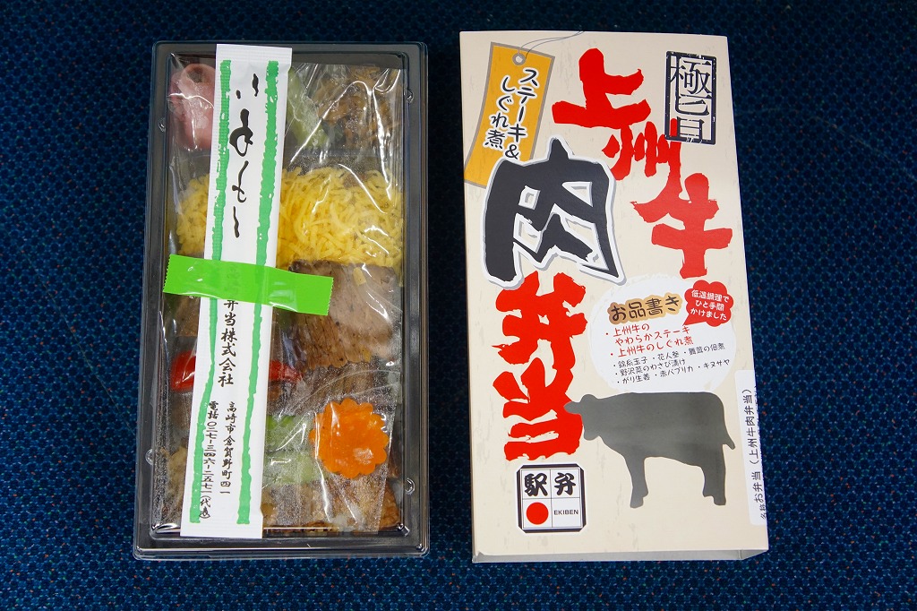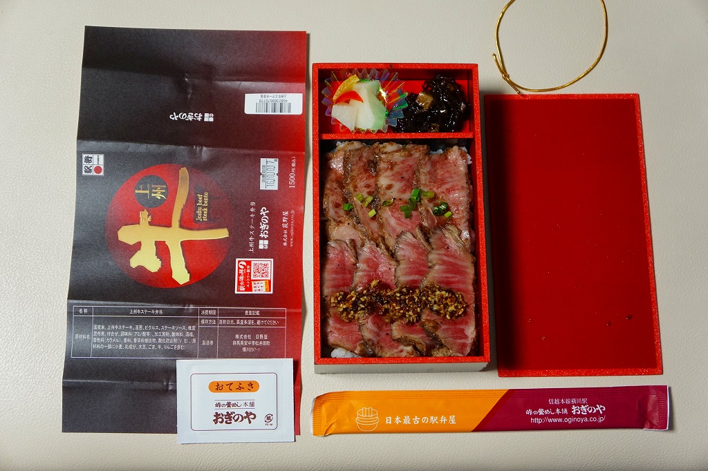 2013(平成25)年3月29日の発売。白御飯に牛肉煮を合わせる、全国各地で相次いて出現する人気の牛肉駅弁と違い、これは御飯の上を錦糸卵、上州牛ステーキ、上州牛しぐれ煮の3ブロックで覆うもの。これにマイタケ佃煮、野沢菜のわさび漬、生姜酢漬を添える。