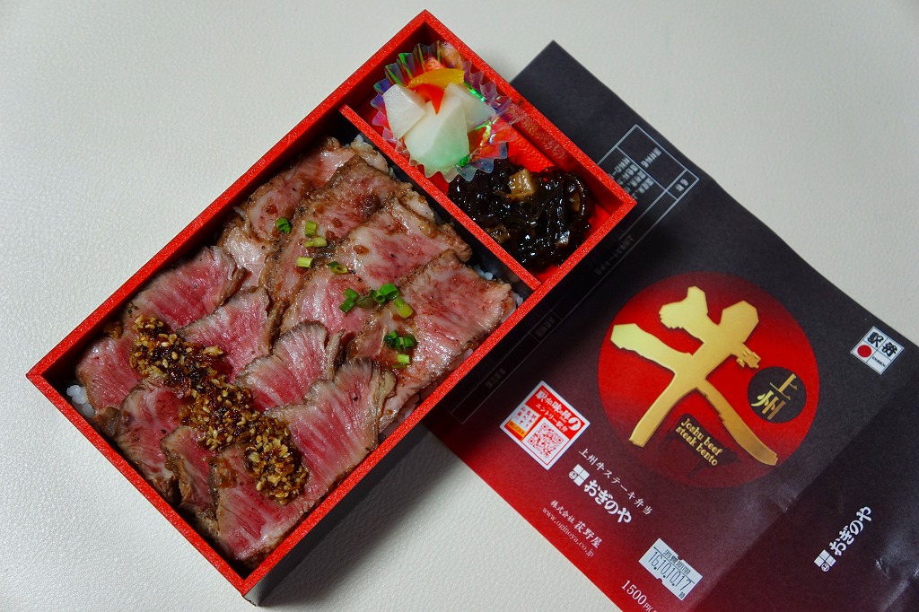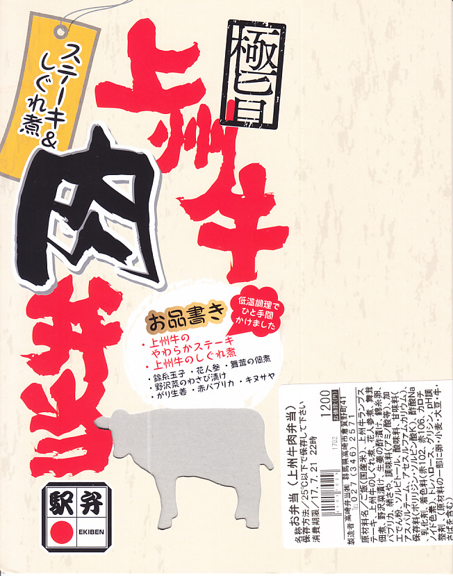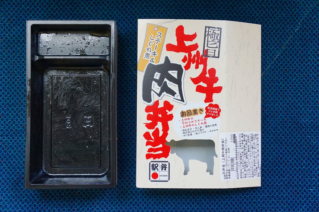 2016(平成28)年5月に高崎駅で発売か。同年10月にはJR東日本の駅弁キャンペーン「駅弁味の陣2016」にエントリー。白御飯を牛ステーキで覆い、昆布煮とピクルスを添える。掛紙と容器の色を含め、牛肉の見た目はローストビーフで、食べれば表面を炙っただけの牛焼肉。血合いも脂の重さもなく、柔らかく薄切りのため食べやすく、タレというかペーストの味も肉の香りを活かす感じ。これは例えば味で武雄温泉に対抗できる、とんでもなくうまい牛肉弁当。2017(平成29)年5月に終売の模様。