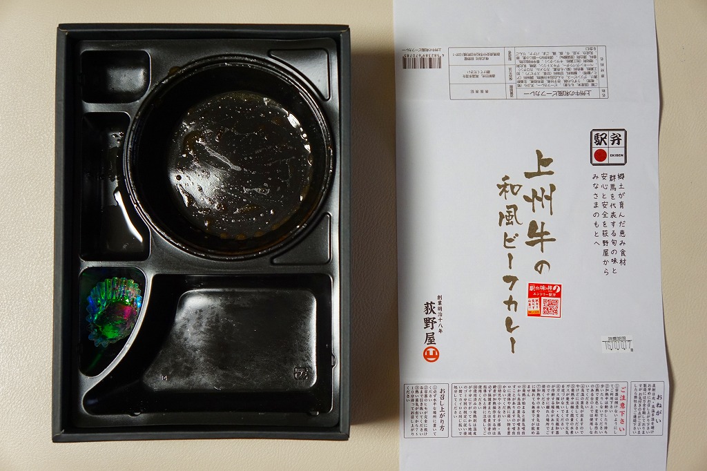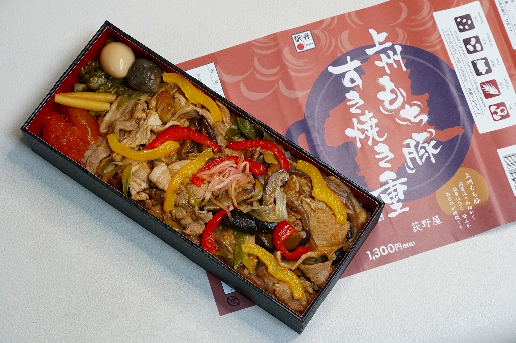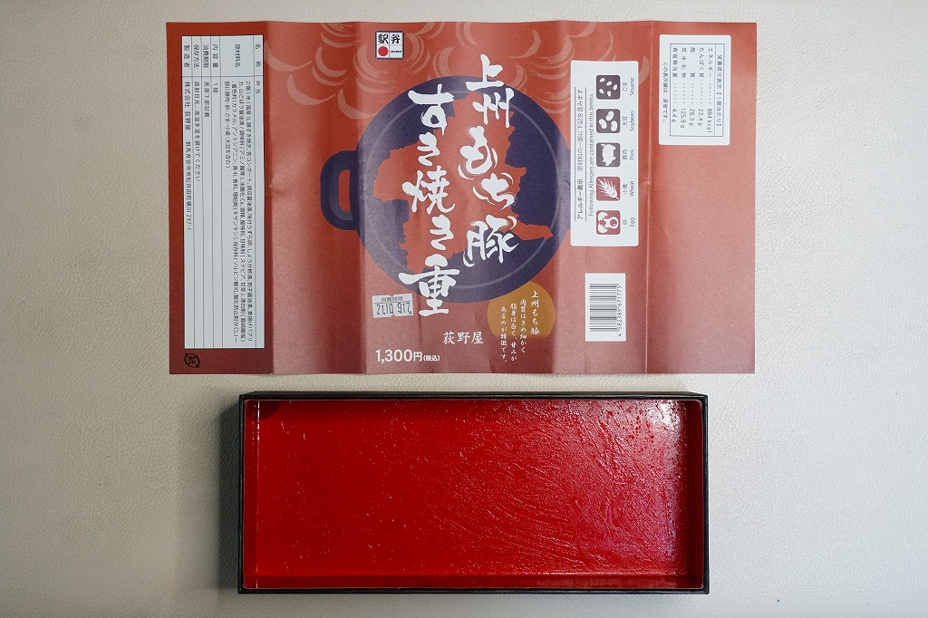 2021(令和3)年10月1日に東京、大宮、高崎、軽井沢の各駅で発売し、高崎駅の駅弁としてJR東日本の駅弁キャンペーン「駅弁味の陣2021」にエントリー。駅弁味の陣に新作を投入し、人気投票期間が終わる11月をもって売り止めるのは、荻野屋の高崎駅弁として例年どおりのやり方。紙製の黒箱に白飯を詰め、豚肉のすき焼きで覆い、うずら卵と各種の漬物にあんずのコンポートを添える。肉はまるで野菜炒めのようで、上州もち豚にナス、しいたけ、パプリカ、こんにゃく、ししとう、ネギなどを混ぜ、具に分量と彩りと味わいを添加した。今回は価格もそれほど高価でなく、こんなに良い駅弁を2か月で売り止めるのはもったいないと思うのも、やはり例年どおり。高崎駅で買えなかったので、東京駅で購入した。今回は珍しく、年明けまで販売した模様。