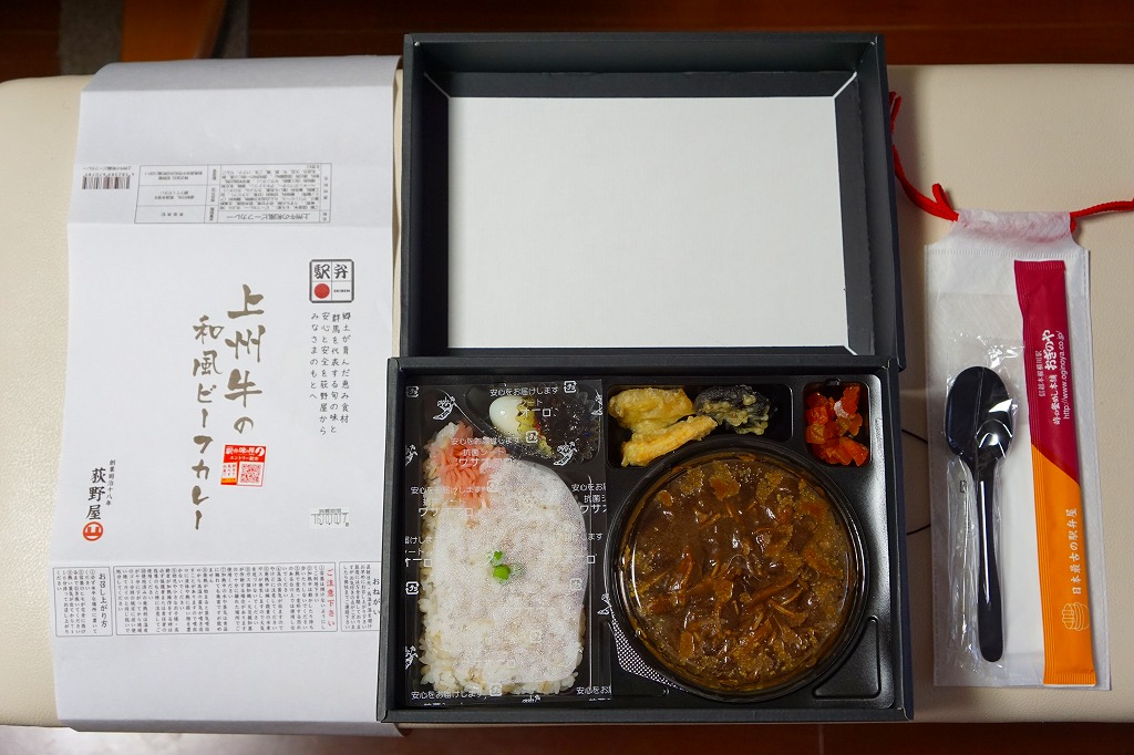 JR東日本の駅弁キャンペーン「駅弁味の陣2016」へのエントリーに合わせて、2016(平成28)年10月1日の発売。容器が大きくなる加熱機能付きにしても、駅弁とは思えぬ巨大な箱。中身は麦の混ぜ御飯と、ふた付きの丸い容器に収めたカレールーと、天ぷら、佃煮、うずらの卵、福神漬。ハイパワーな加熱機能で、アツアツのカレーができあがる。箱の大きさと、プラ製スプーンの貧弱さで、これは列車内ではなく、自宅や宿などまともな食卓と食器がある場所で食べるものだと思った。ルーをちゃんとすくうことができれば、これはおいしいエノキカレー。会期とともに11月限りで終売。