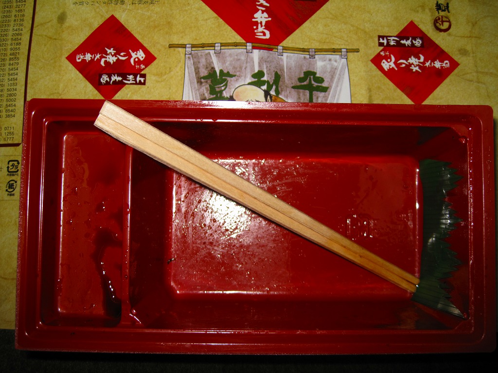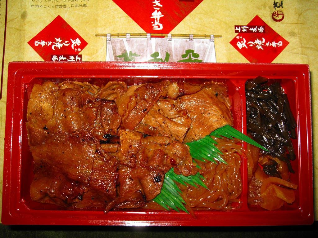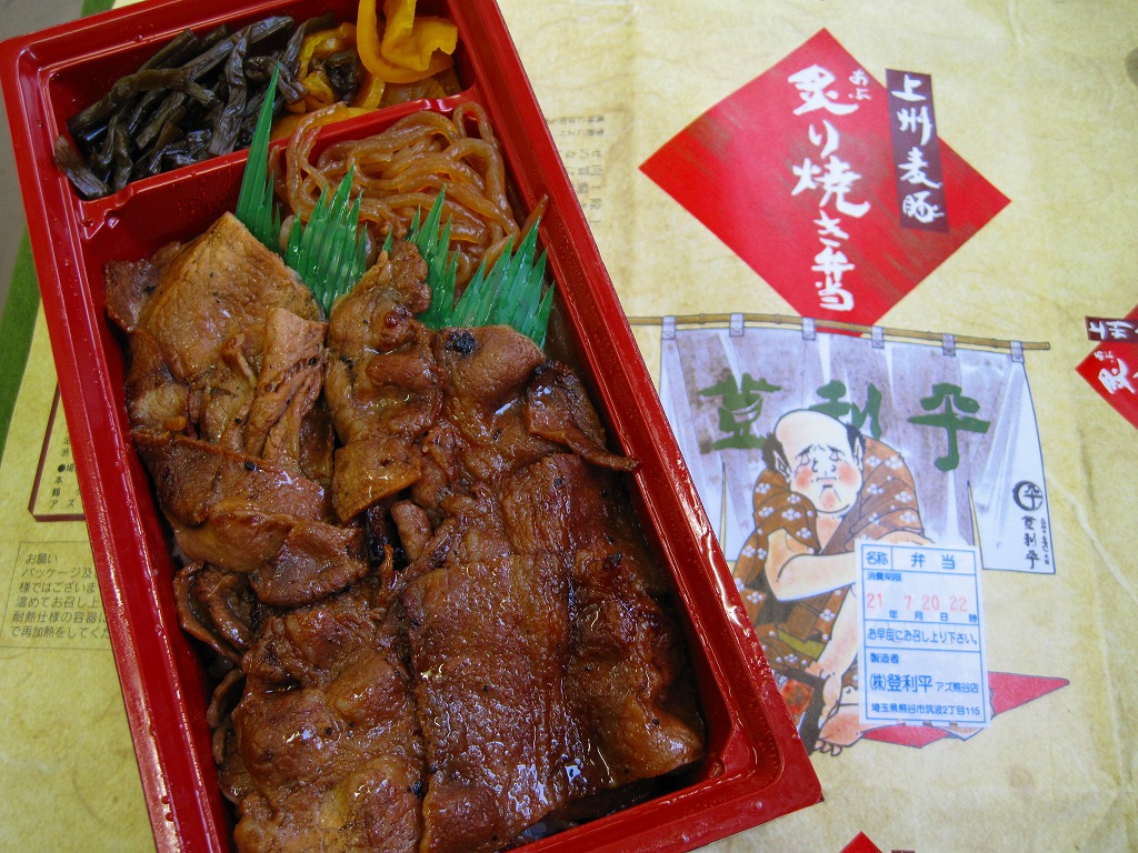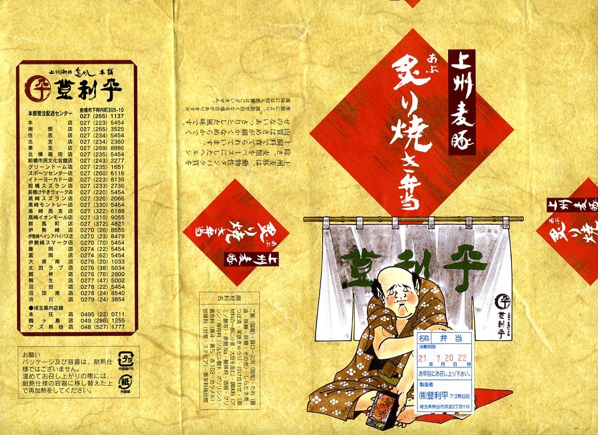 長方形の黒い容器に割りばしを置いて輪ゴムで留め、これをまるごと包装紙で包む。赤いプラ製トレーに収まる中身は、白御飯の上を上州麦豚のロースの焼肉としらたきで覆い、つぼ漬と葉唐きゅうりを添えるもの。鶏肉の弁当ではないけれど登利平ブランドの商品。薄く広い豚肉がトリ並みにあっさりした異色作。価格は2009(平成21)年の購入時で780円、2017年時点で830円、2023年時点で900円。