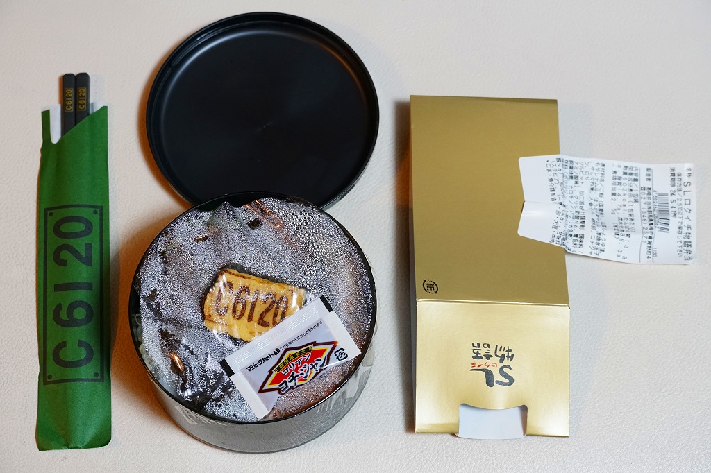 中身は竹炭で黒く染めた御飯の上にエビ、榛名豚チャーシュー、鶏肉焼、シイタケやタケノコなどの煮物、うずらの卵、クリ、梅干、蒲鉾、マイタケなどを載せるもの。SL列車に乗れば買わずにはいられないだろうし、味も負けていない。蒸気機関車D51498が現役である限り商品寿命を保てそう。2010年度には年間で約1万8千個を売り上げたという。価格は2008年の発売時で800円、2011年時点で900円、2014年時点で1,000円、2020年時点で1,100円、2022年時点で1,250円、2023年時点で1,350円、2024年10月から1,450円。11月までに箸のナンバープレート印刷をとりやめる。