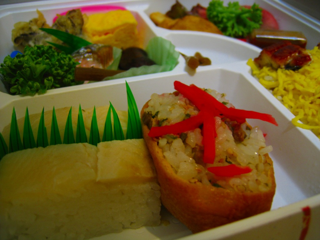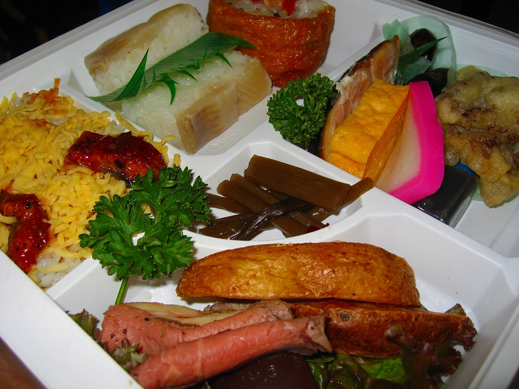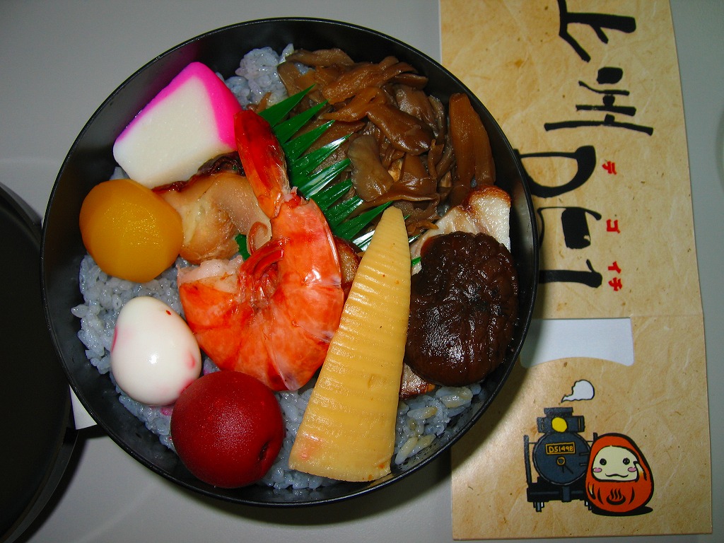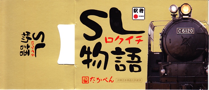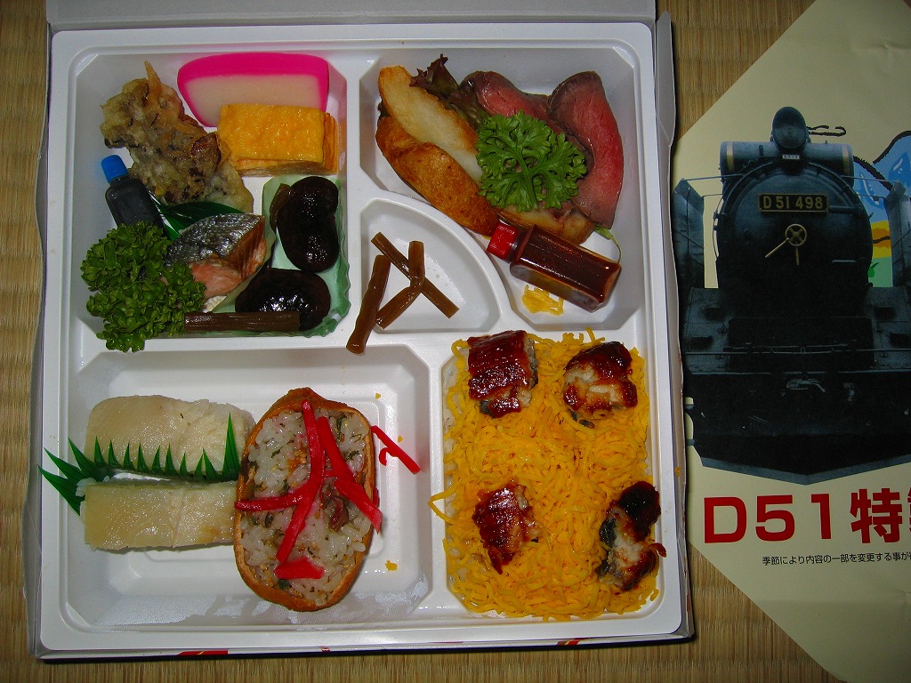 2005(平成17)年の夏休み期間中限定に売られた駅弁。23センチ四方もある巨大な正方形ボール紙容器には、臨時列車名と蒸気機関車が大きく描かれる。中身はひつまぶし、岩魚鮨、稲荷寿司の三種の御飯に、ローストビーフとポテトフライ、舞茸天・焼き魚・蒲鉾・玉子焼に付け合わせ。脈絡のない内容はともかく、容器の大きさに負けてスカスカな見栄えはいただけないが、他に流用ができない専用の紙箱で記念駅弁を用意する姿勢はうれしいもの。