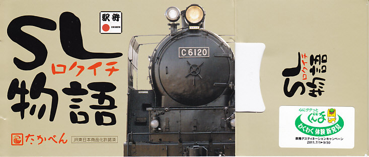 2011(平成23)年7月15日に購入した、高崎駅弁のスリーブ。上記の2024年のものと変わらない。容器もお箸も変わらない。当時の中身は、黒米混じりの御飯つまり古代米の赤飯に、牛肉煮、鶏八幡巻、マイタケ煮、クリ、うずら卵、梅干し、ニンジンと、C6120の焼き印が入る玉子焼と、SLの動輪に見立てた真っ黒なレンコンが3輪。