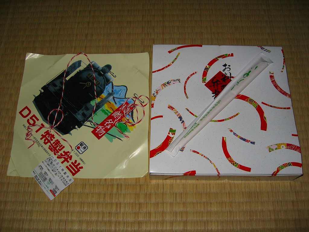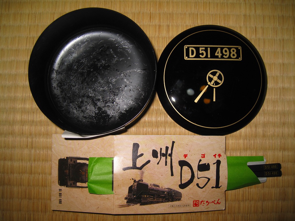上記の駅弁「上州D51弁当」の、2008(平成20)年の発売時や購入時の姿。容器と中身は上記の2011年のものと変わらない。当時は特製のお箸でなく高崎駅の駅弁に共通の割りばしを付け、スリーブの上面でなく側面にSLがいた。