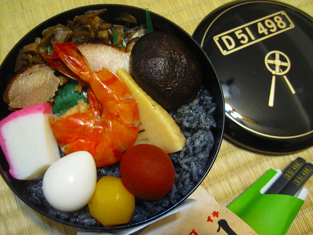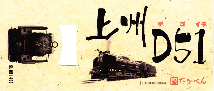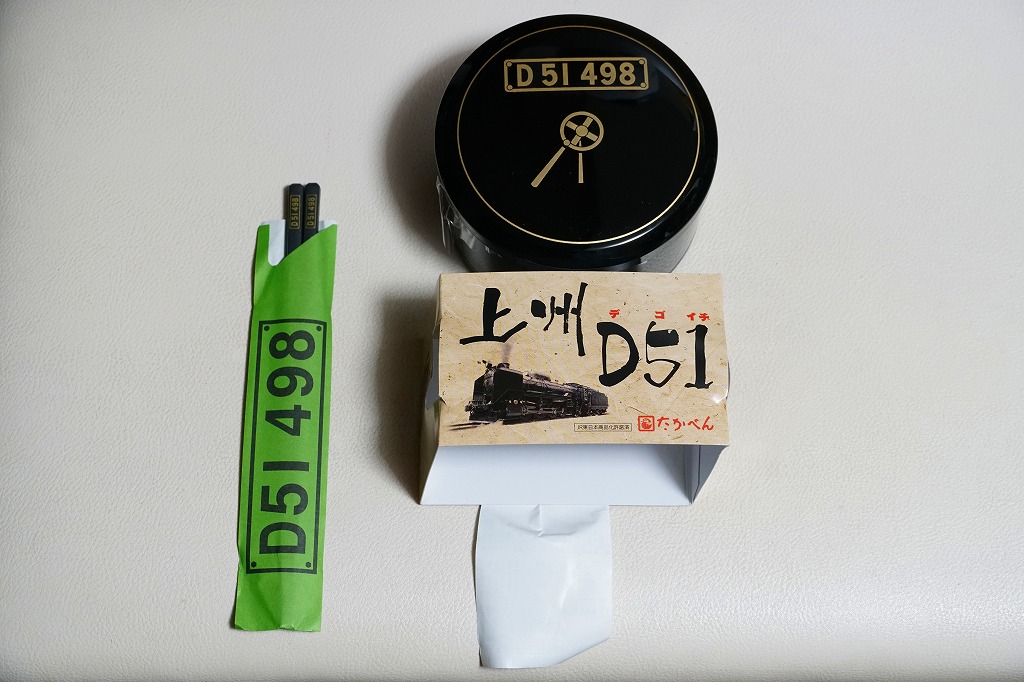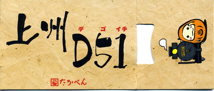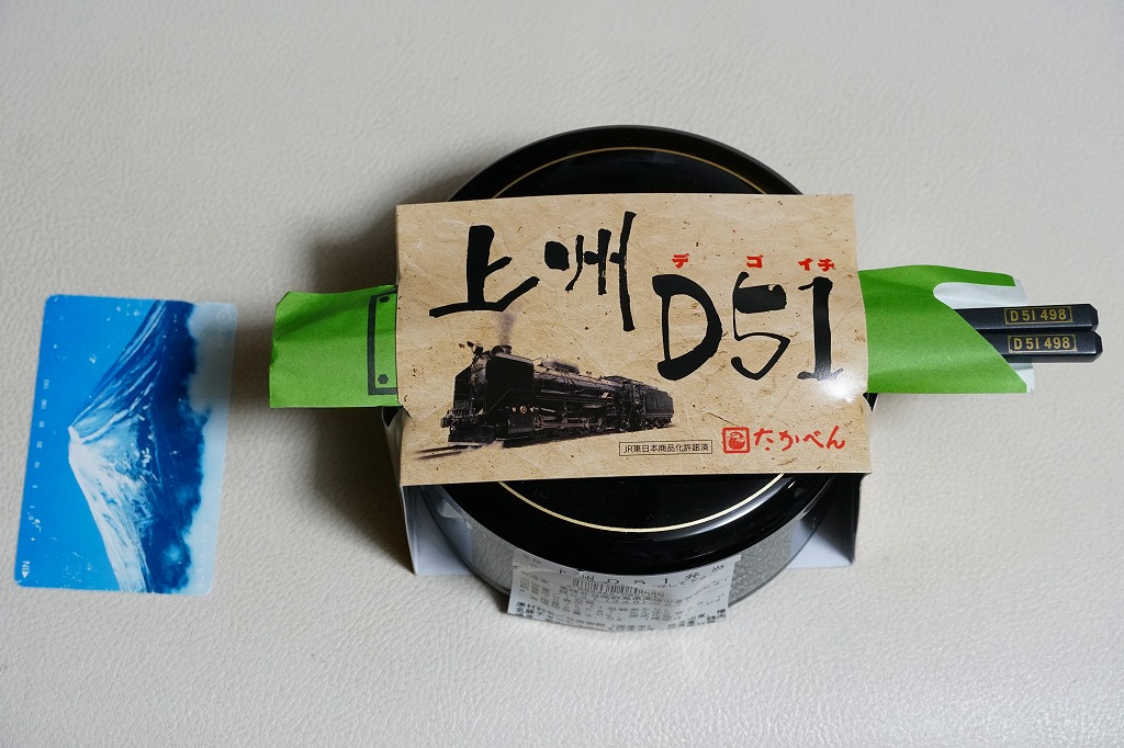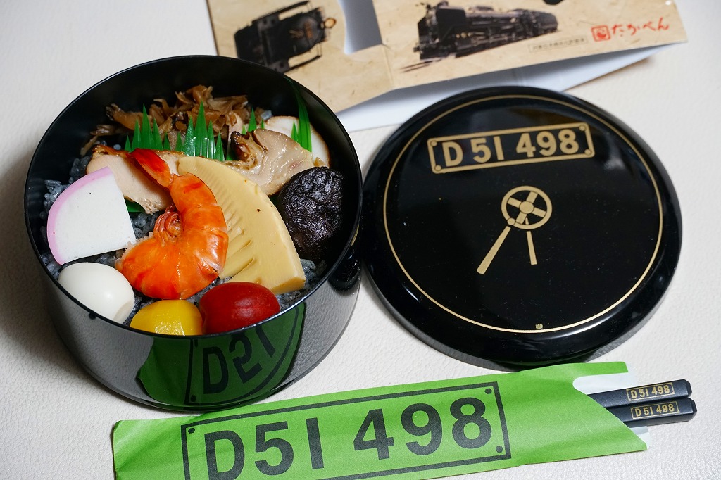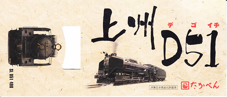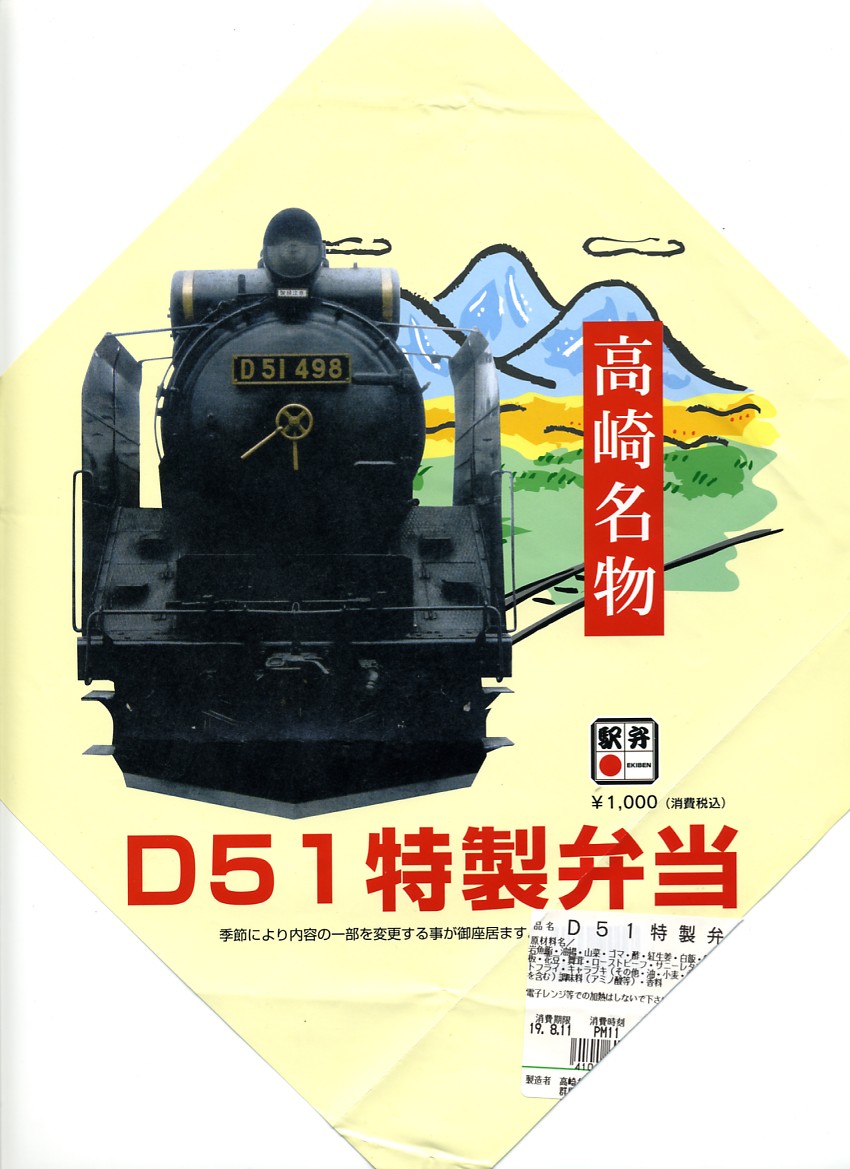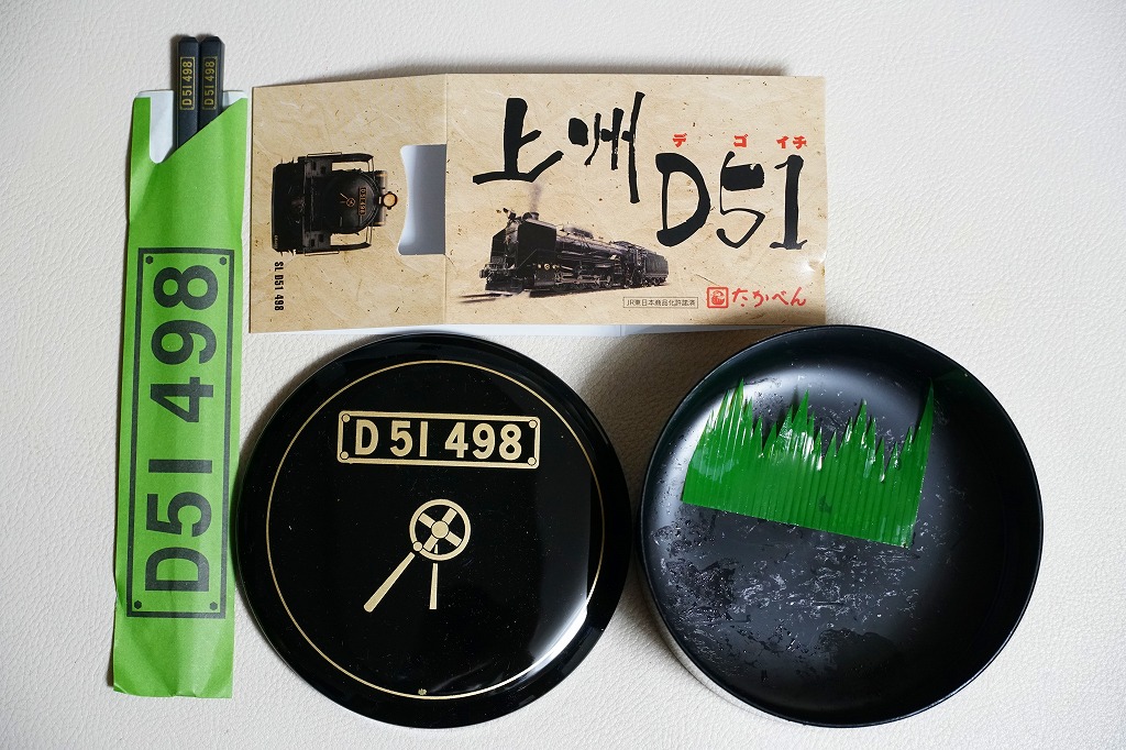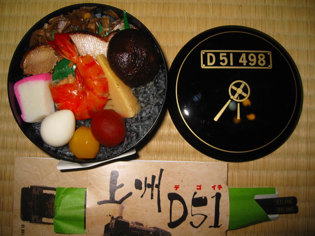 1990年代から上越線で親しまれる観光列車「EL&SL奥利根号」の、2008(平成20)年夏の運転開始に合わせて、同年7月19日に発売。駅弁の名前は「上州D51弁当」とも。北海道の疑義駅弁を含む海鮮弁当でよく使われるタイプの丸いプラ容器を真っ黒にして、フタを縁取りナンバープレートとハンドルを描くだけで、蒸気機関車の煙室扉つまり前面に見えてくるデザイン。これを駅弁の名前と機関車のイラストを描くスリーブに収め、ナンバープレートを印刷した黒いお箸を付ける。