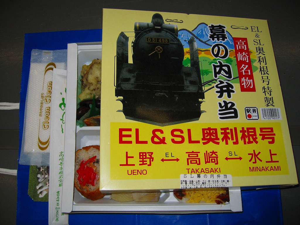 名前は異なるが、つまり下記の駅弁「EL&SL奥利根号特製高崎名物幕の内弁当」と同じもの。専用紙箱が市販紙箱と専用掛紙の組み合わせに変わり、中身のいくらいなりが山菜いなりに変わっている。相変わらず個々の食材は見栄えも風味も良く、でも内容に脈絡がなく詰め方が雑な、食事というよりおつまみセットの雰囲気な記念駅弁。上記のプラ容器の駅弁の発売により、役目を終えた模様。