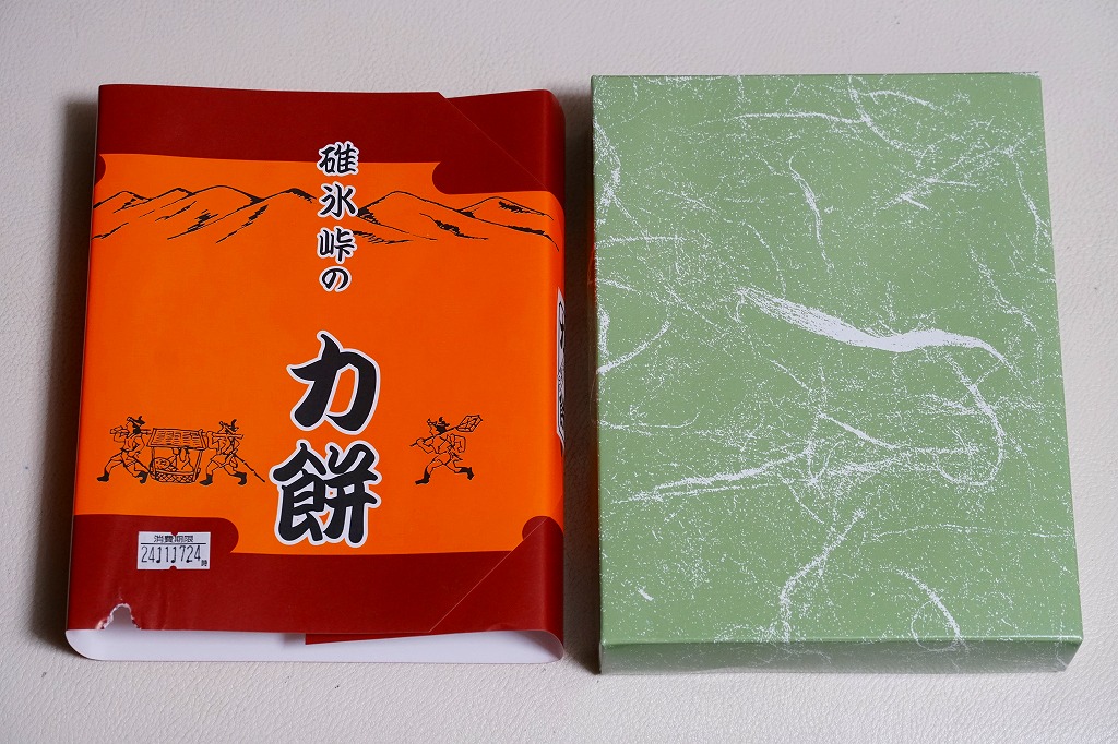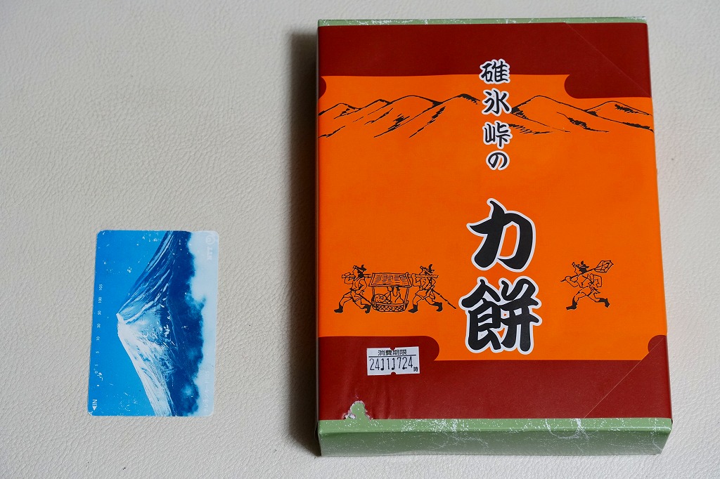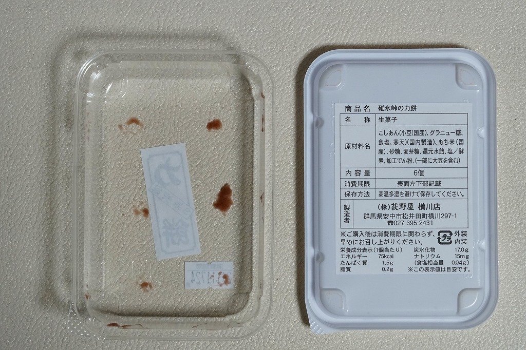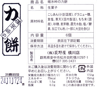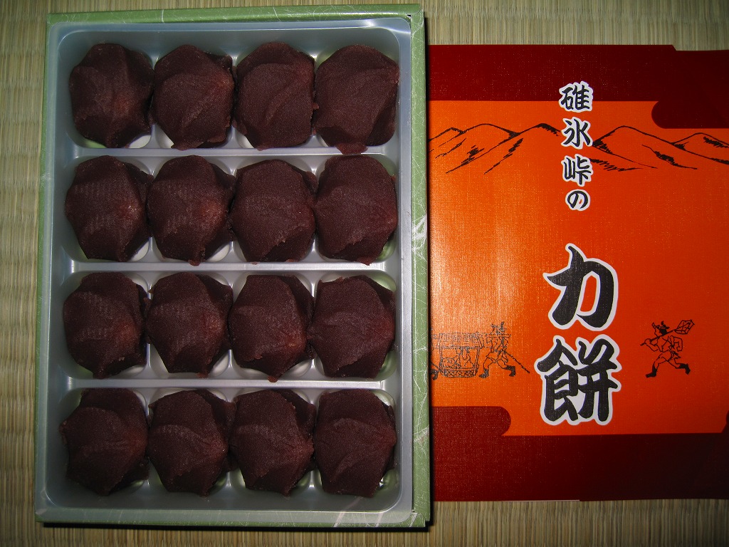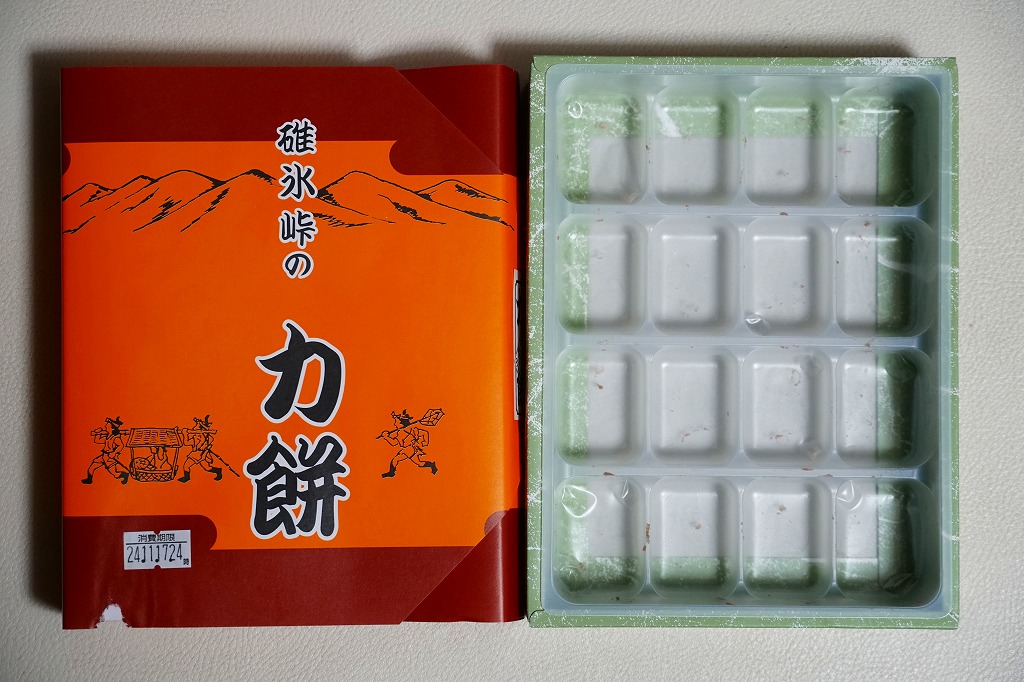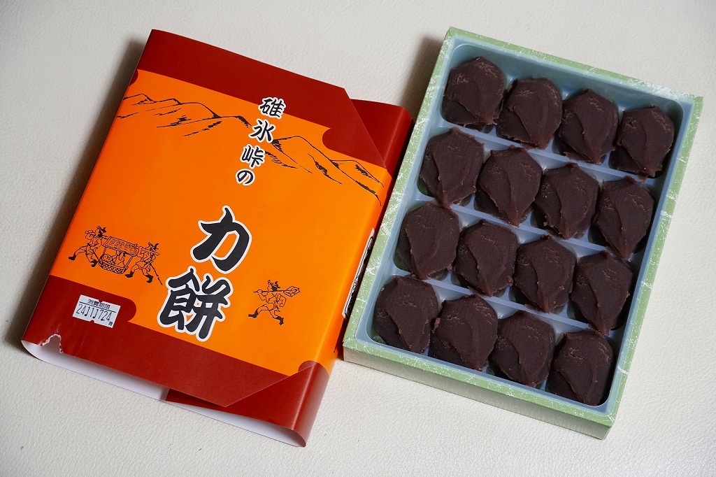 全国各地の峠道で見掛ける「峠の力餅」の碓氷峠版。厳選された小豆と餅米を使用し、さっぱりとした甘さだというあんころもちが6個入っている。自身の足で歩かずに電車で楽して来てしまうと、当然に甘ったるい。2003年時点で24個入りは1,050円、16個入りは735円、この6個入りは価格を失念していたが、後の訪問で315円と判明。2023年時点で24個入りは1,188円、16個入りは864円、この6個入りは400円。