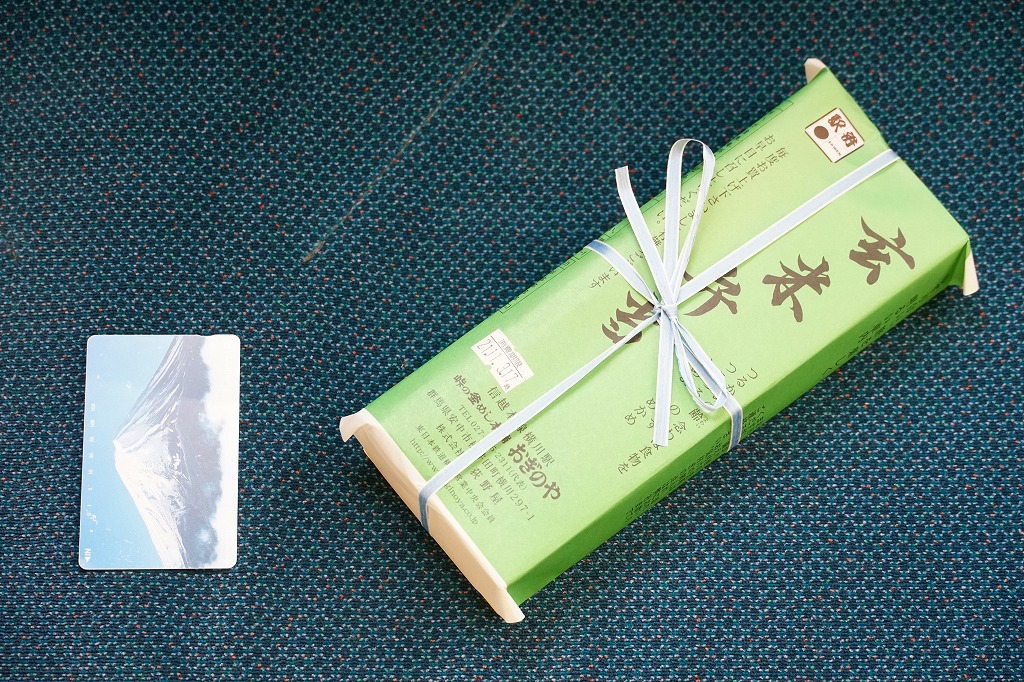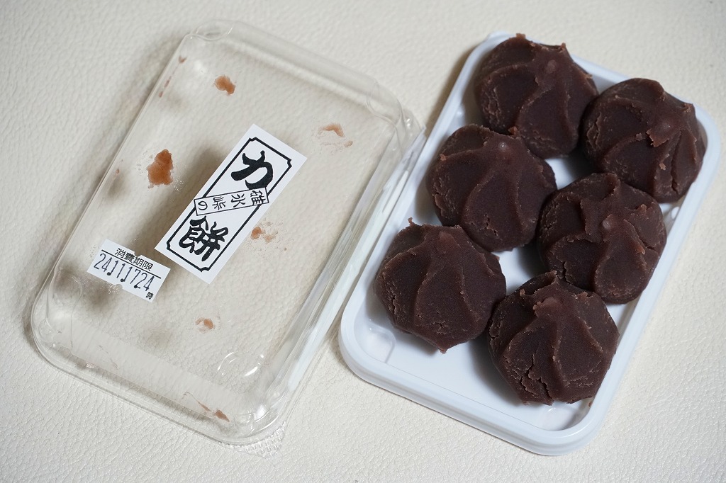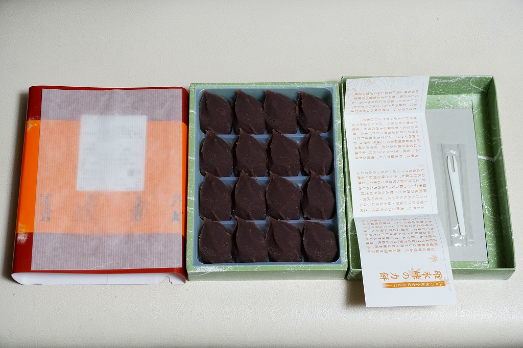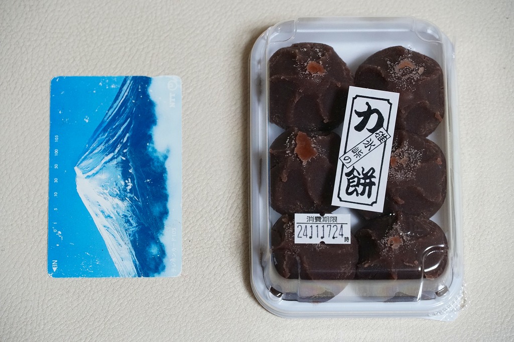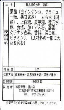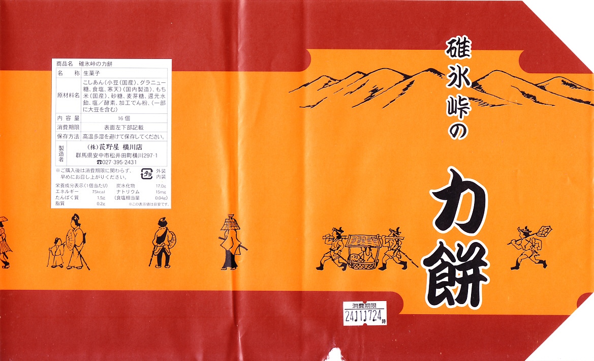 全国各地の峠道で見掛ける「峠の力餅」の碓氷峠版。厳選された小豆と餅米を使用し、さっぱりとした甘さだというあんころもちが6個入っている。自身の足で歩かずに電車で楽して来てしまうと、当然に甘ったるい。2003年時点で24個入りは1,050円、16個入りは735円、この6個入りは価格を失念していたが、後の訪問で315円と判明。2023年時点で24個入りは1,188円、16個入りは864円、この6個入りは400円。