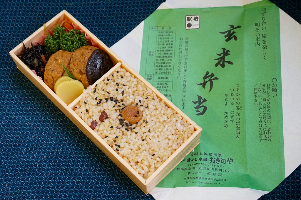 玄米が世に健康食として認知されるはるか前の、1974(昭和49)年12月に横川駅で発売。小柄でとても細長い長方形の容器の、6割くらいに玄米の日の丸御飯を詰め、残りにがんもどき、きんぴら、ひじき、しいたけ等のおかずを詰め込む。おかず要らずの味付け玄米飯は、おかずとともに歯応えが豊か。長らく500円だった価格は、2020年時点で650円、2023年時点で800円。