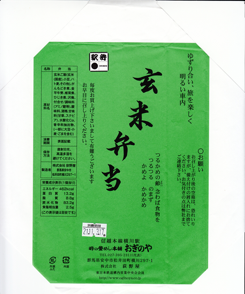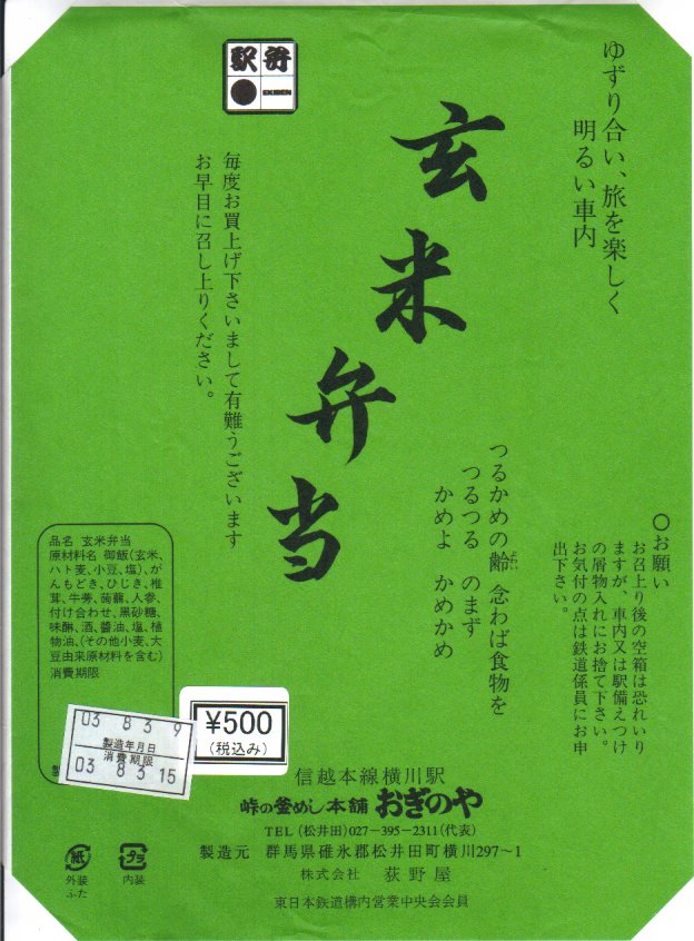 2003(平成15)年8月3日に購入した、横川駅弁の掛紙。この玄米弁当もまた、横川と日本を代表する駅弁「峠の釜めし」と同じく、1974年の発売時からその姿と中身を変えていない。下記の1997年のものと比べて、JR東日本の1990年前後の観光キャンペーン「LOOK EAST」のロゴがようやく取れ、駅弁マークが右から左へ移動し、食品表示が加わり、「無農薬」「無添加」の表記がなくなった。