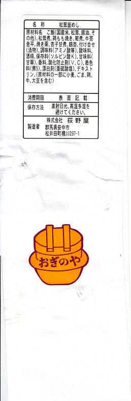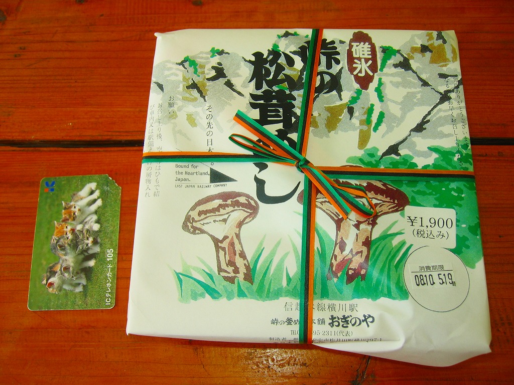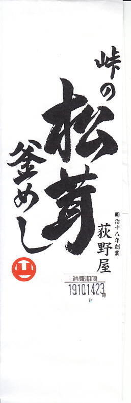 1983(昭和58)年に1,500円で発売か。横川駅で秋限定の駅弁であり、松茸駅弁の最高峰であり、入手が困難である幻の駅弁。9月頃から10月頃まで横川駅や軽井沢駅や一部の直営ドライブインで販売されるそうだが、発売期間が短いうえに販売個数も少なく予約も不可、入手に数年から十年以上を要した駅弁ファンがざらにいた。この日は11時に改札脇のそば屋に入荷したところを捕まえた。
