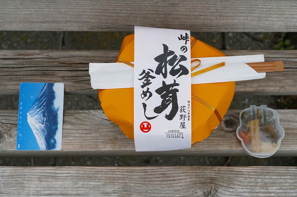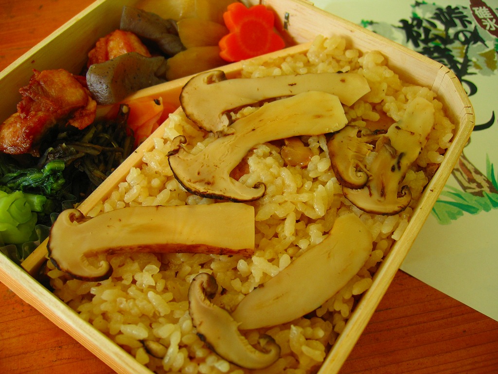 形も大きさも厚さも部位も不揃いな松茸が、やはり松茸の小片をごろごろと混ぜた御飯の上に、にょきにょきと生えている本物の松茸飯。価格はしばらく1,700円であったが、2005年から1,900円。駅弁に使う松茸は駅弁屋所有の山から採ってくるとも、信州産が入荷した日だけ駅弁を作るとも言われる。