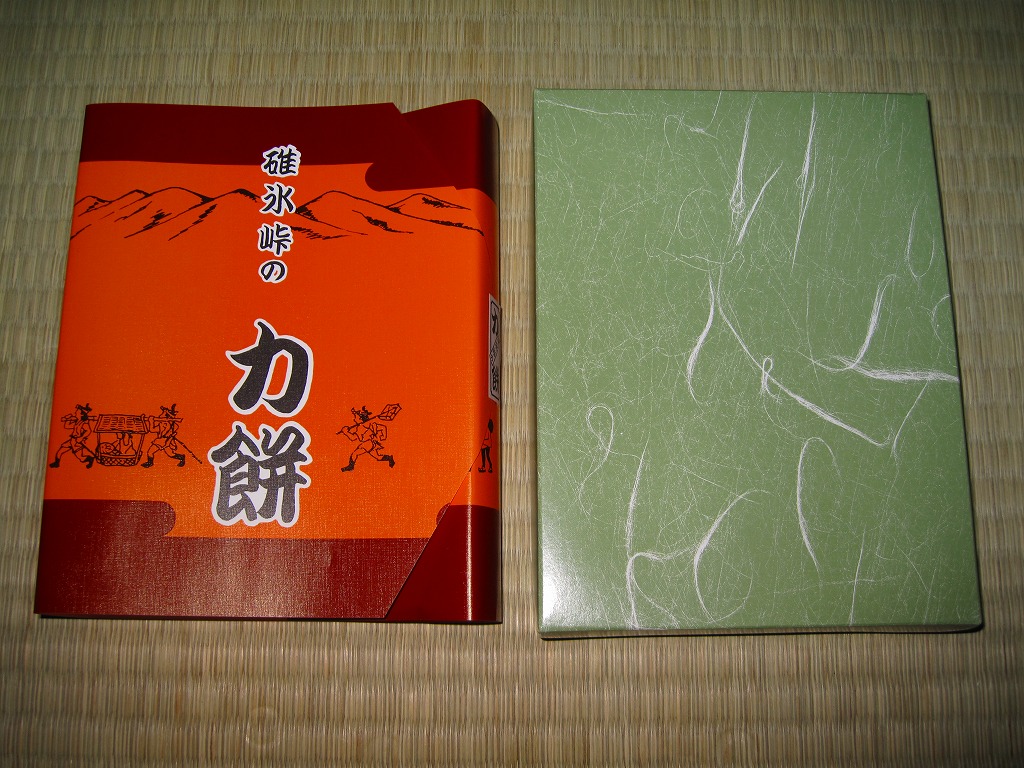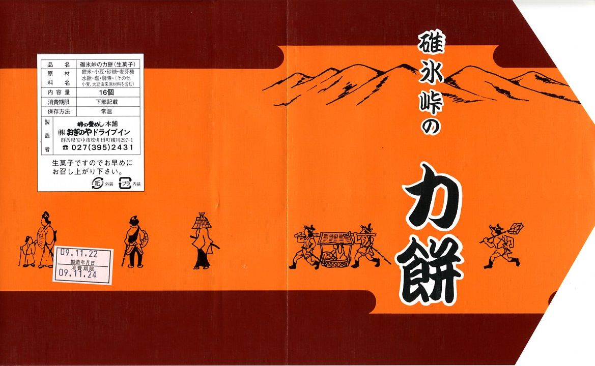 上記の商品「碓氷峠の力餅」の、2009(平成21)年時点での姿。上記の2024年のものと同じ。中身はもちろん、包装もまったく同じ。調製元の名前が、横川駅近くの国道沿いにある調製元の店舗の名前が、おぎのやドライブインから荻野屋横川店に変わったくらい。