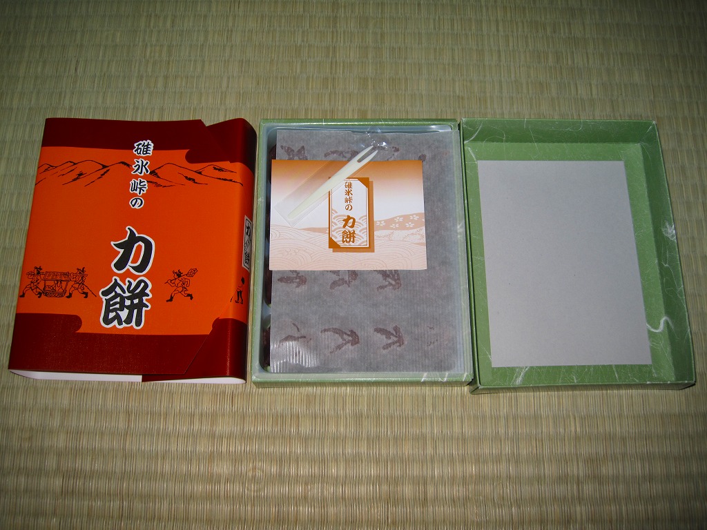 碓氷峠の力餅の、本来のパッケージ。紙箱に半透明のプラ製トレーを入れて、4×4=16個の力餅なるあんころもちが収納されている。日持ちはおそらく3日間。碓氷峠で力餅を売る店は、他にいくつかあるそうな。価格は2009年の購入時で735円、2023年時点で864円。
