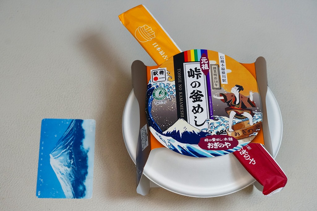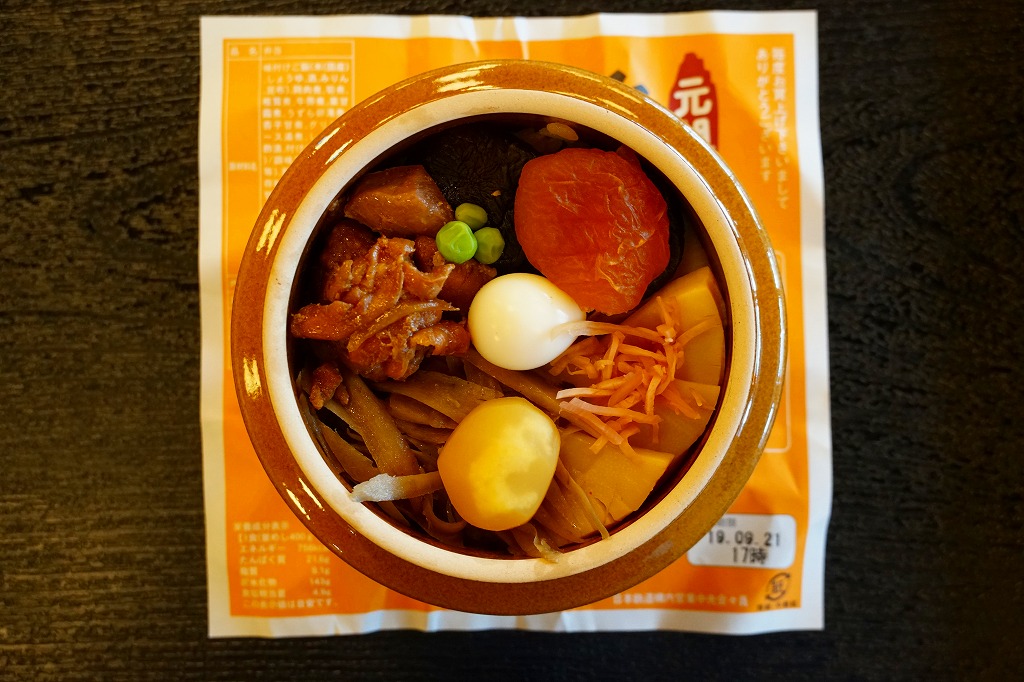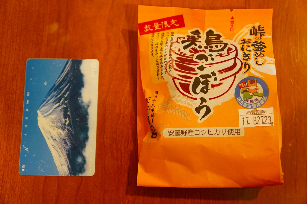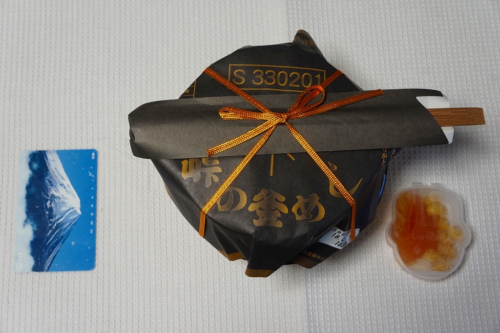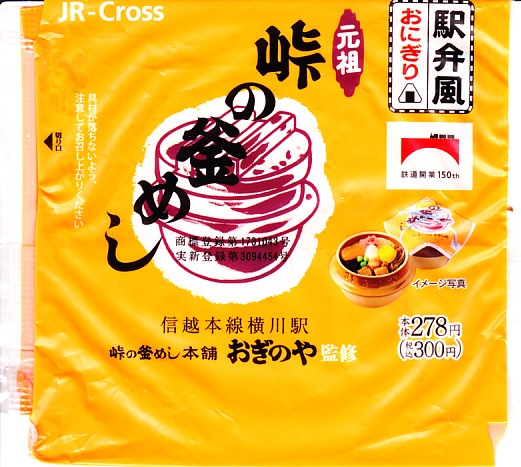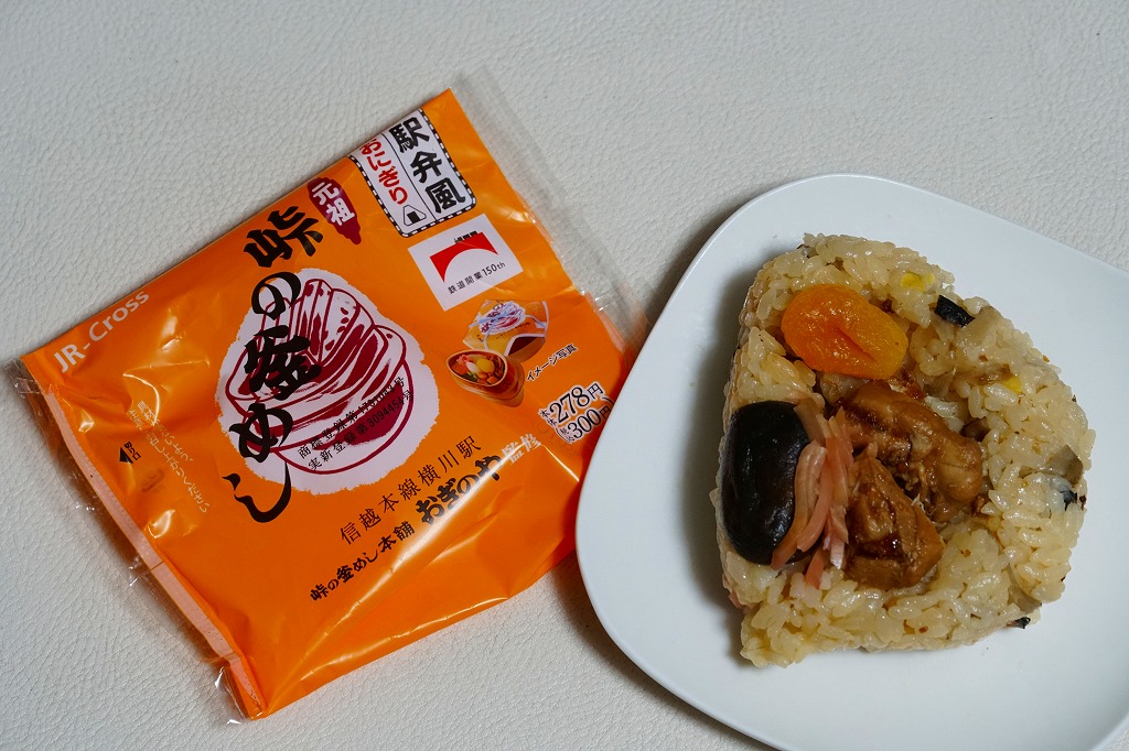 これは横川駅弁の荻野屋が監修し、埼玉県のJR東日本クロスステーションが製造し、駅のコンビニで販売する企画商品。駅弁の峠の釜めしの掛紙と同じ絵柄の袋に、鶏肉とシイタケと紅生姜とアンズを具にした、栗とごぼうとシイタケの炊込飯でできたおにぎりを詰める。「峠の釜めし」のおにぎりは上記のとおり公式に現存し、軽井沢駅やドライブインで販売されるが、こちらは鶏飯から一歩踏み込んで、おにぎりにあるまじき具を入れることで、より駅弁の「峠の釜めし」に似せてきた気がした。
