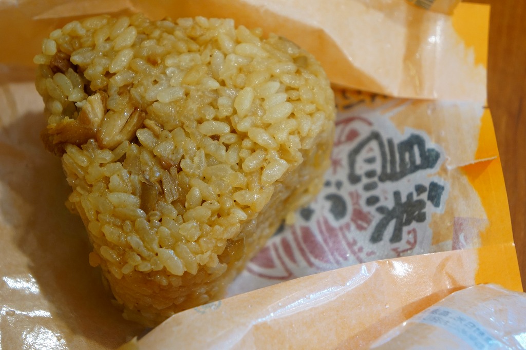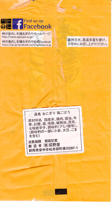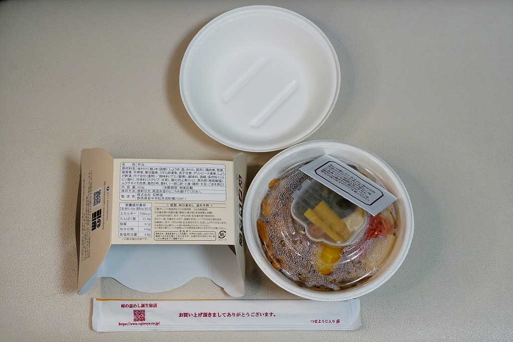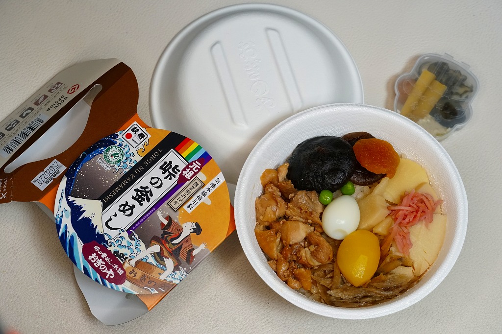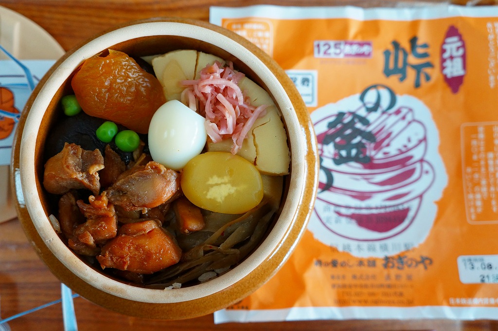 これは横川駅弁の荻野屋が監修し、埼玉県のJR東日本クロスステーションが製造し、駅のコンビニで販売する企画商品。駅弁の峠の釜めしの掛紙と同じ絵柄の袋に、鶏肉とシイタケと紅生姜とアンズを具にした、栗とごぼうとシイタケの炊込飯でできたおにぎりを詰める。「峠の釜めし」のおにぎりは上記のとおり公式に現存し、軽井沢駅やドライブインで販売されるが、こちらは鶏飯から一歩踏み込んで、おにぎりにあるまじき具を入れることで、より駅弁の「峠の釜めし」に似せてきた気がした。