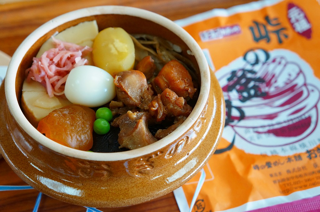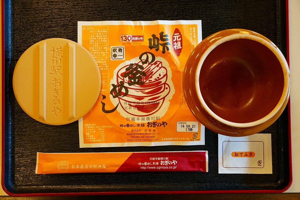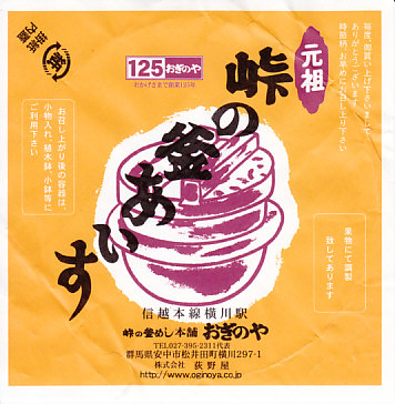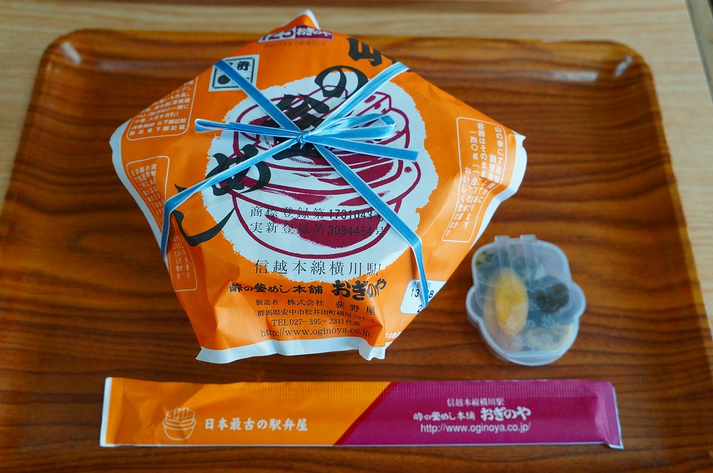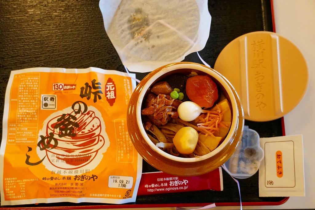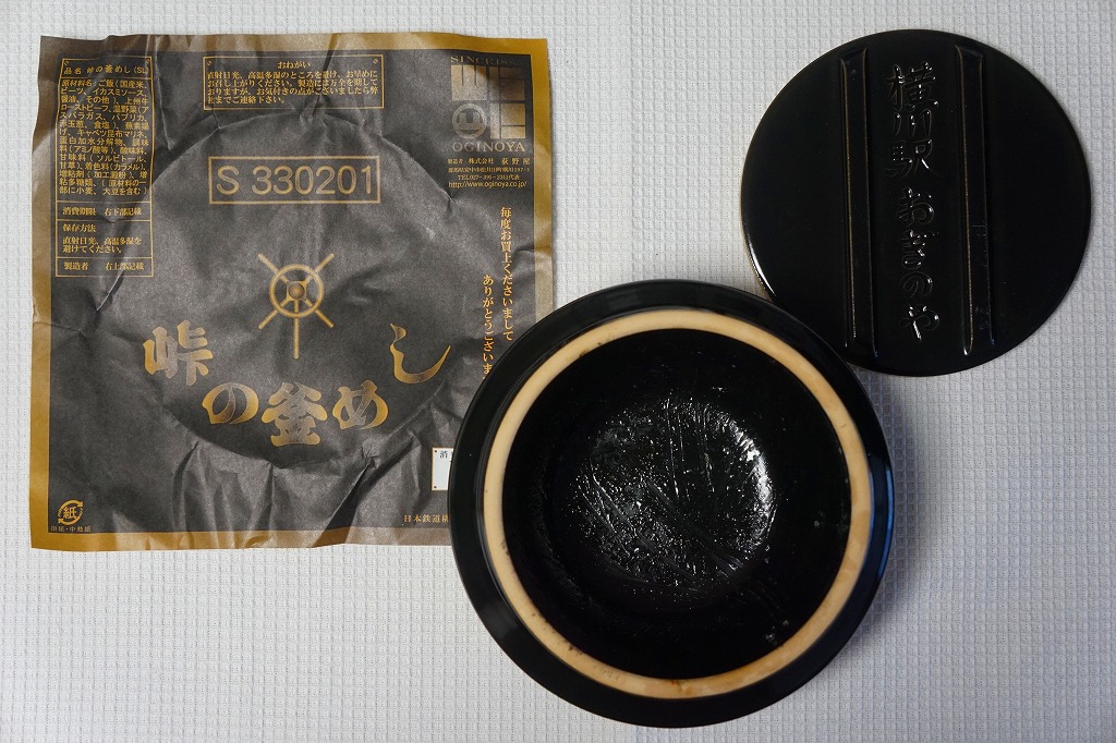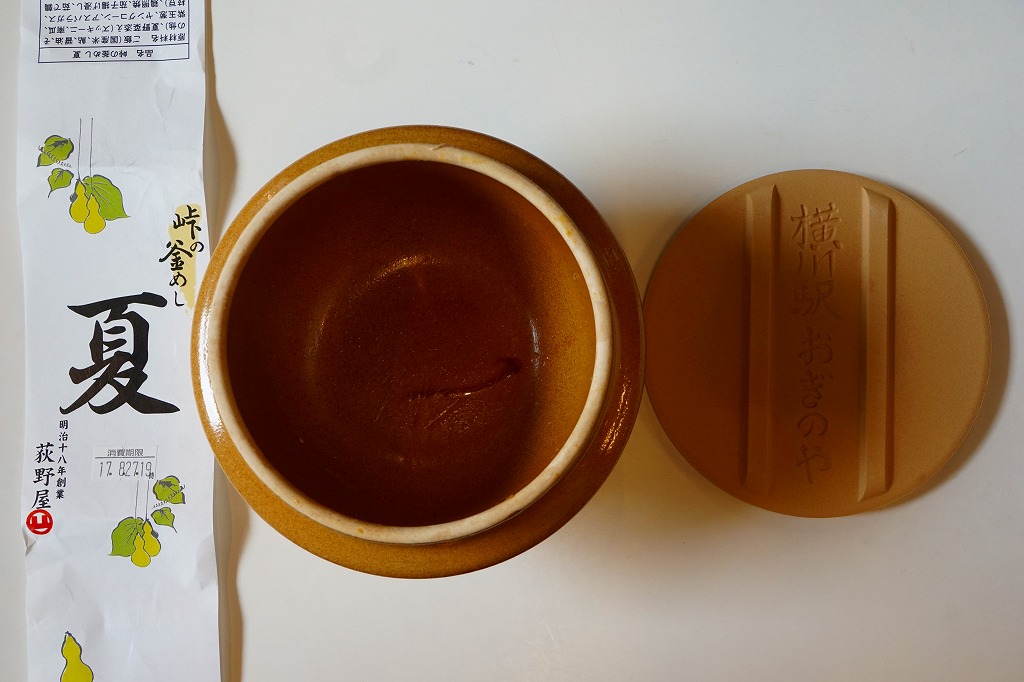 1958(昭和33)年2月に横川駅で発売。その前年の12月に横川駅で非公式に発売したとする文献もある。今さら説明することもない、日本で最も有名な駅弁の一つ。焼き物を容器とした初めての駅弁とされる。益子焼の釜の中に茶飯を詰め、その上に鶏肉、タケノコ、ゴボウささがき、椎茸、栗・、ンズ、うずらの卵、紅生姜、グリーンピースを載せる。ふたも陶製で、掛紙をかけて紙ひもでしばり、釜型プラ製の別容器で5種の漬物を添付して出来上がり。