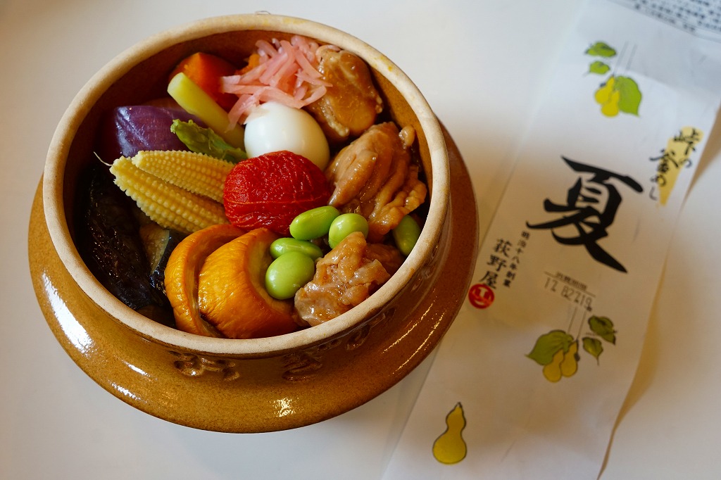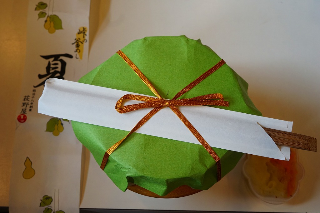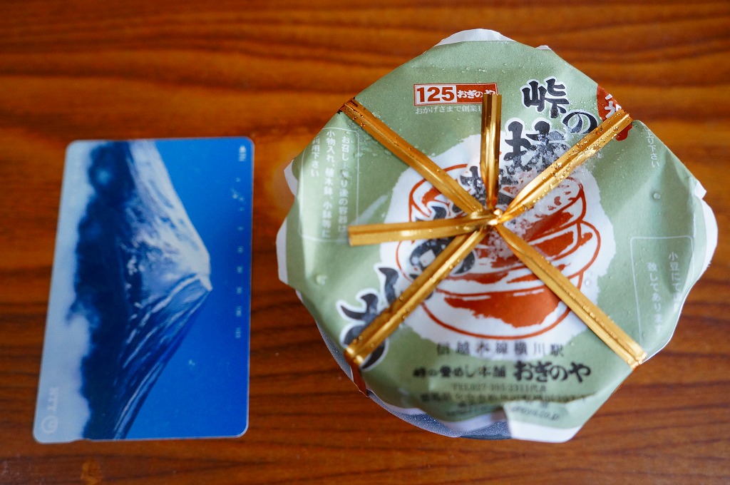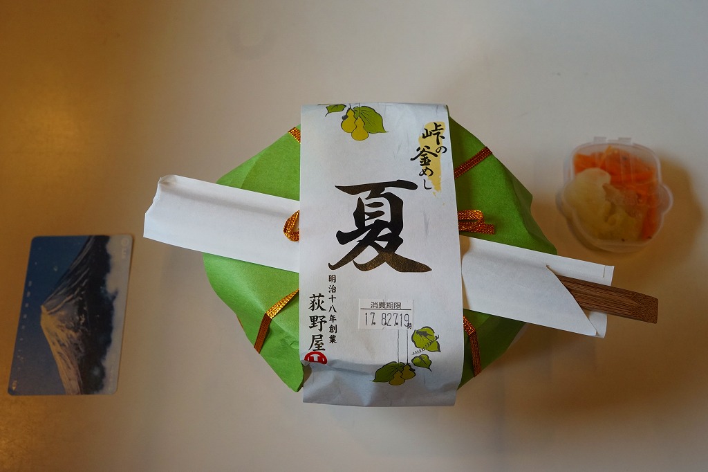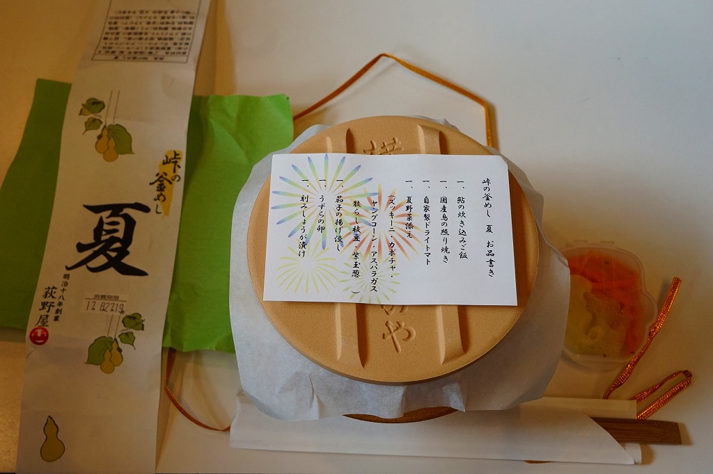 峠の釜めしの販売55周年を記念して、2013(平成25)年の春から横川のドライブインとサービスエリアで売られる商品。四季の変化を織り込んだプレミアムな釜めしという位置付けで、春夏秋冬の4種類を毎年回している。今回買えたのは5年目の「夏」。横川駅弁「峠の釜めし」と同じ益子焼の容器に、おしながきを置き、抹茶色の包装紙を載せて、「夏」と描かれた掛紙を巻く。