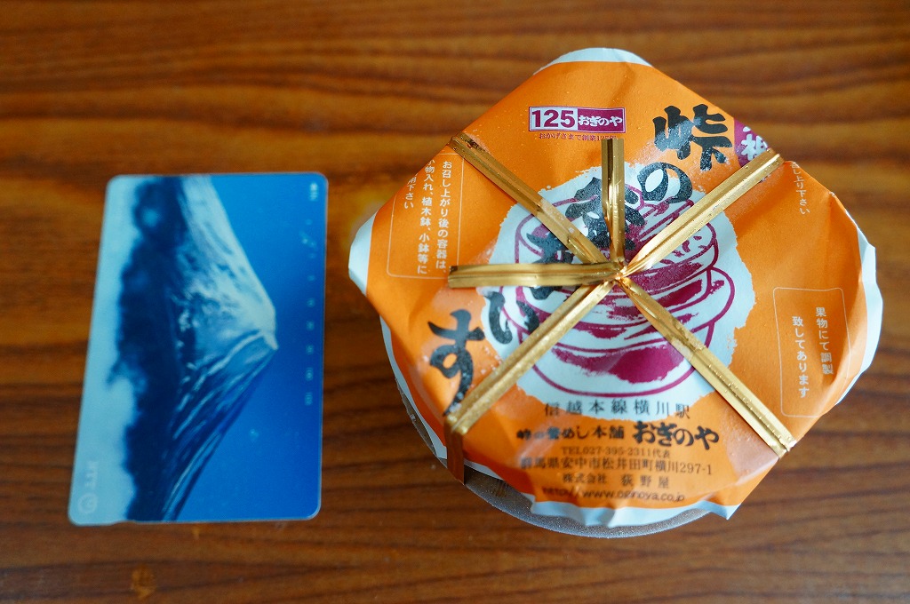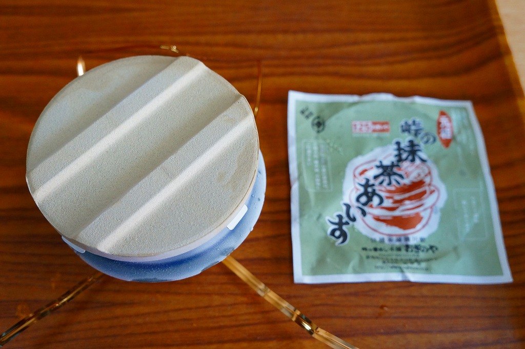 2005(平成17)年か、それ以前の発売か。駅では売らず、上信越自動車道横川サービスエリアが主戦場。駅弁の昔の「峠の釜めし」そっくりで、4割くらいの大きさのとても小さな陶器の釜に抹茶アイスを詰めて、あずきとクリームを載せる。