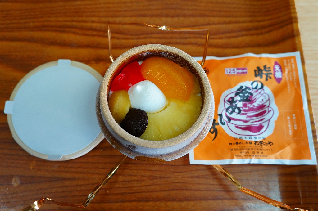 2005(平成17)年か、それ以前の発売か。駅では売らず、上信越自動車道横川サービスエリアが主戦場。駅弁の今の「峠の釜めし」そっくりで、4割くらいの大きさのとても小さな陶器の釜にバニラアイスを詰めて、駅弁の具に見えなくもない色彩でクリーム、くり、チョコレート、パイナップル、あんず、サクランボを載せる。