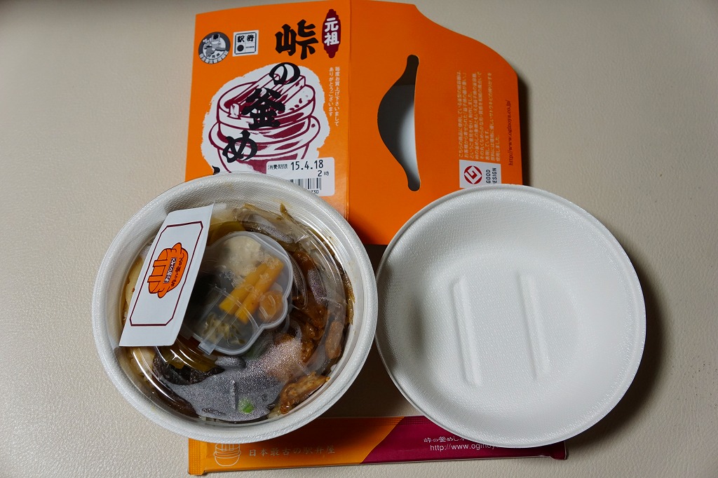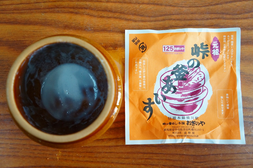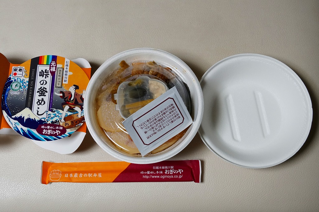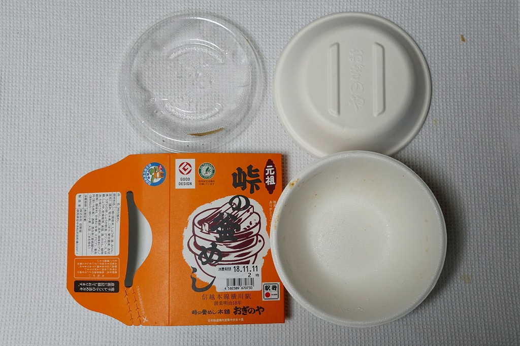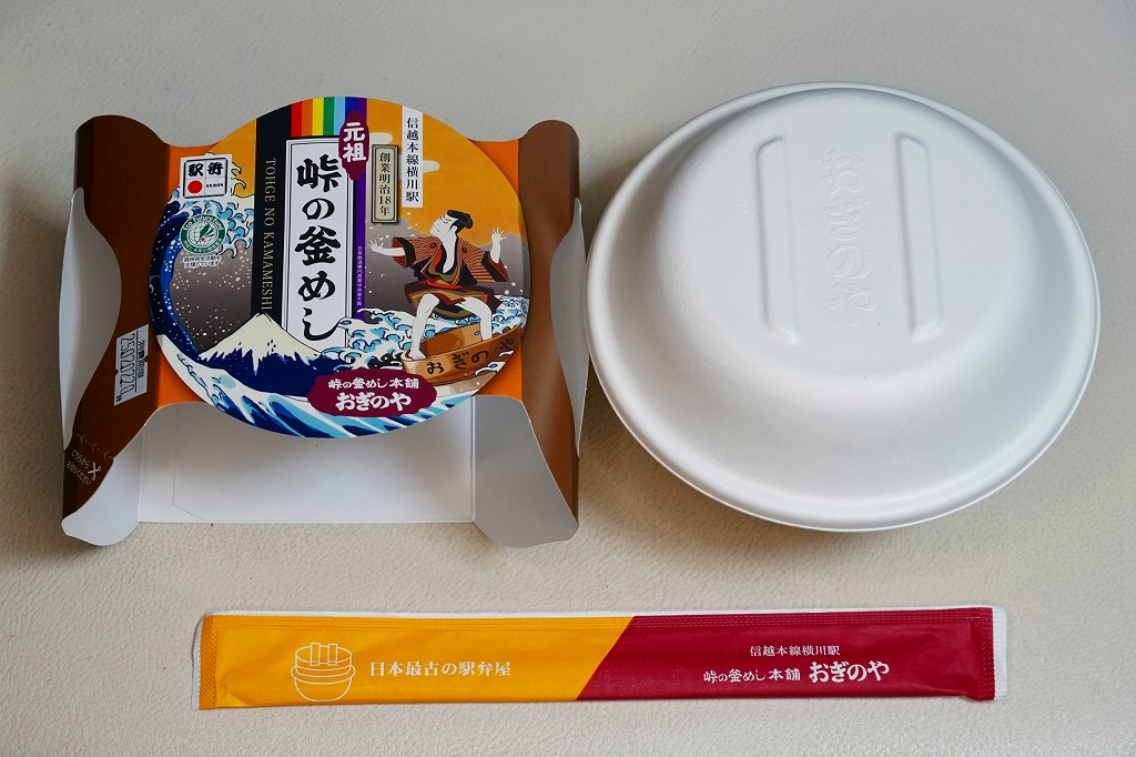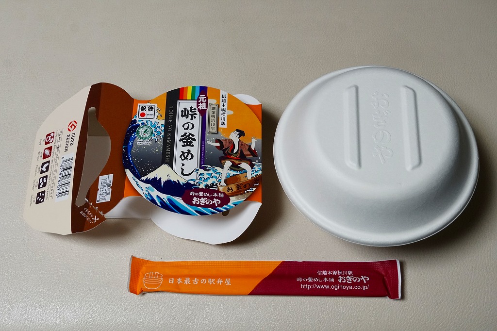 この駅弁のボール紙の枠には『「益子焼の器が重い。」というご意見を受け』制作したとあるが、客の捨て釜が来る鉄道会社と空港管理会社とバスツアー会社を除いて、そんな意見を本気で言う人がいるのだろうか。名物の駅弁と同じ味を当時お徳に食べられた利点と同時に、この駅弁を名物にした大切なものを省いた寂しさを感じた。2017(平成29)年10月のJR東日本の駅弁キャンペーン「駅弁味の陣2017」に、この紙容器版がエントリーされ、峠の釜めしの器が紙になってしまったと、ネット上がざわついた。