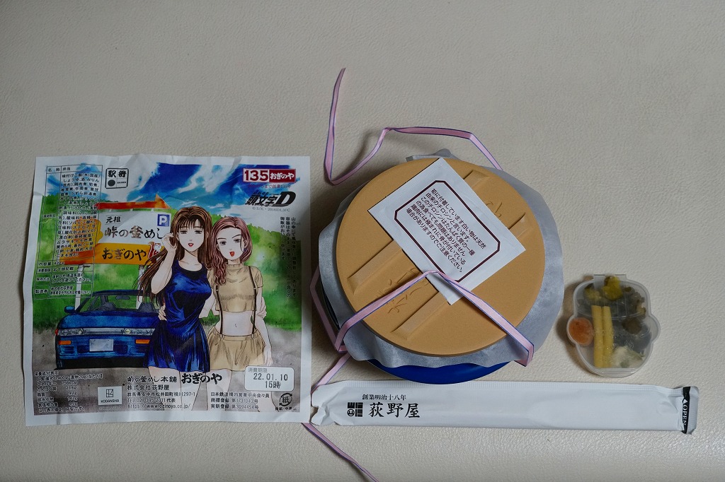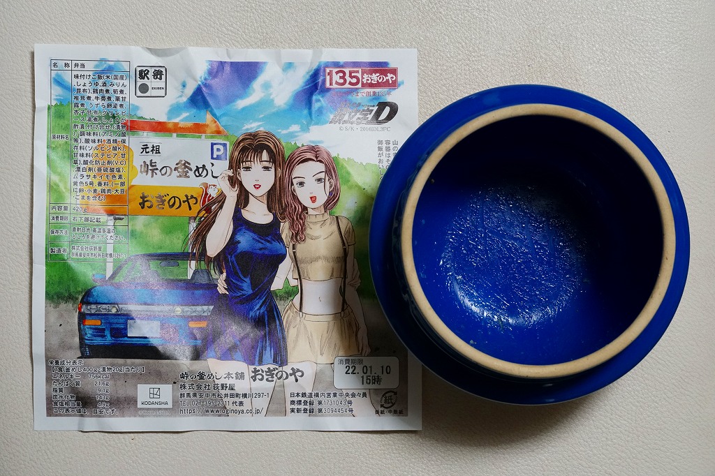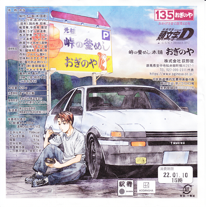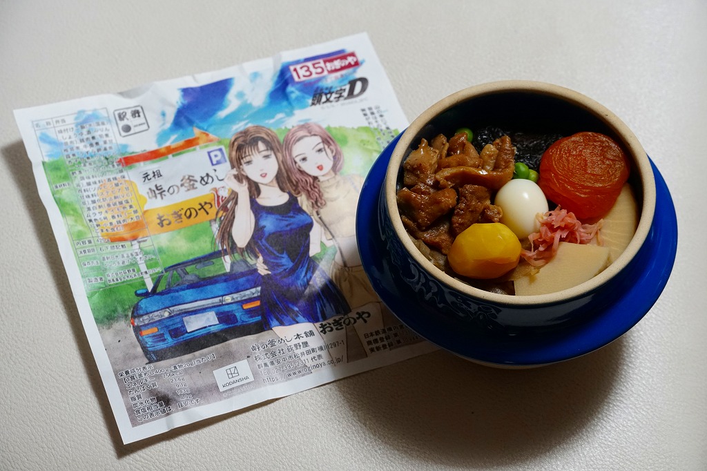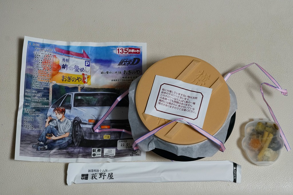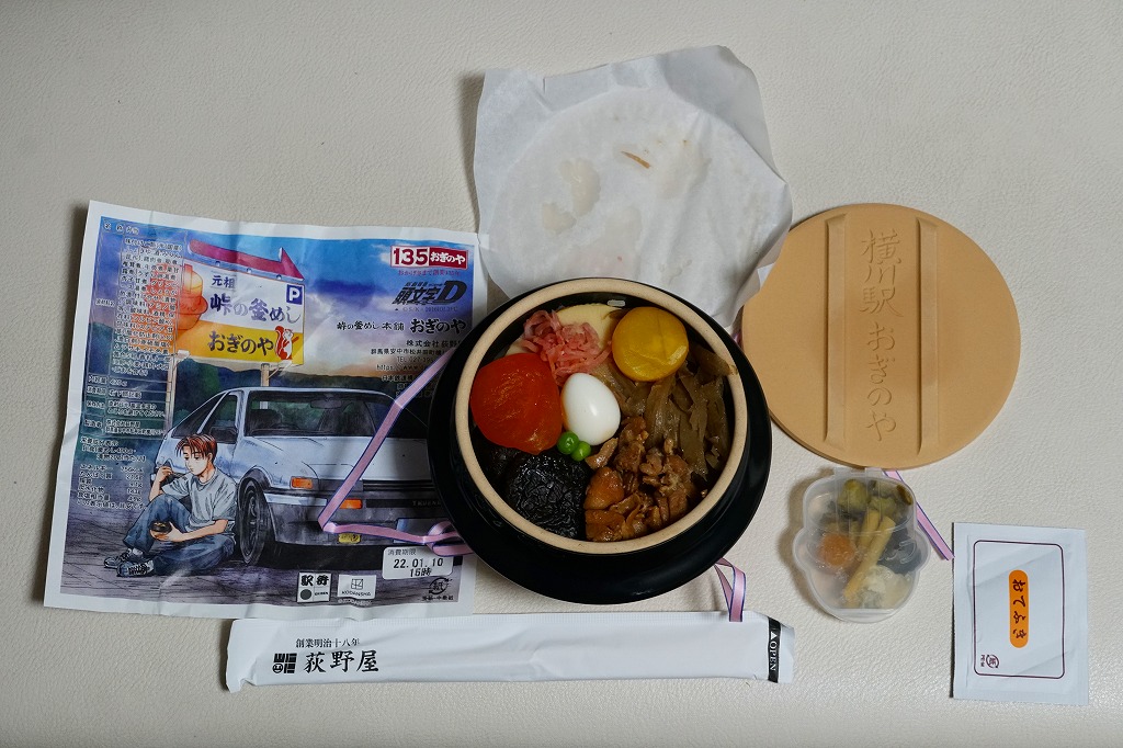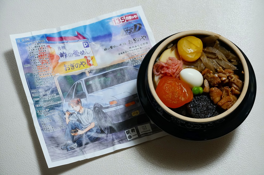 2021(令和3)年11月6、7、13、14日に荻野屋横川店と関越自動車道上里サービスエリアで販売。翌2022年1月の京王百貨店の駅弁大会で予約販売。横川駅の駅弁「峠の釜めし」について、しげの秀一の漫画作品「頭文字D」(イニシャル・ディー)で、今回は2016年公開の映画「新劇場版 頭文字D Legend3 −夢現−」とのコラボにより、色違いの器と特製の掛紙2種類を用いて販売した。