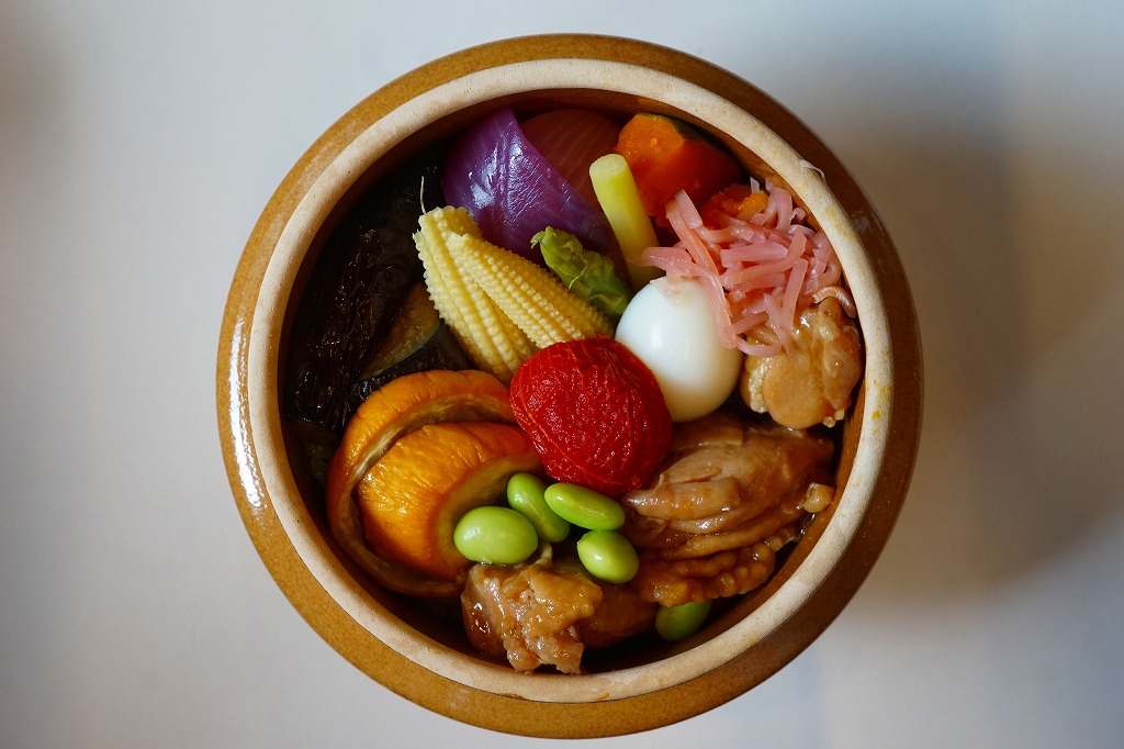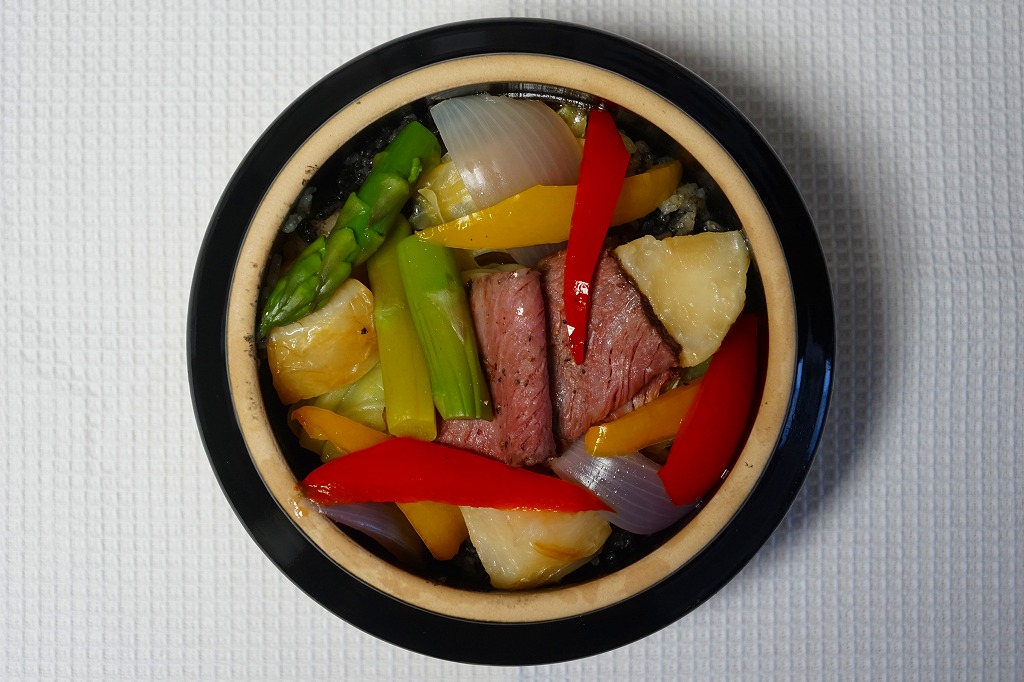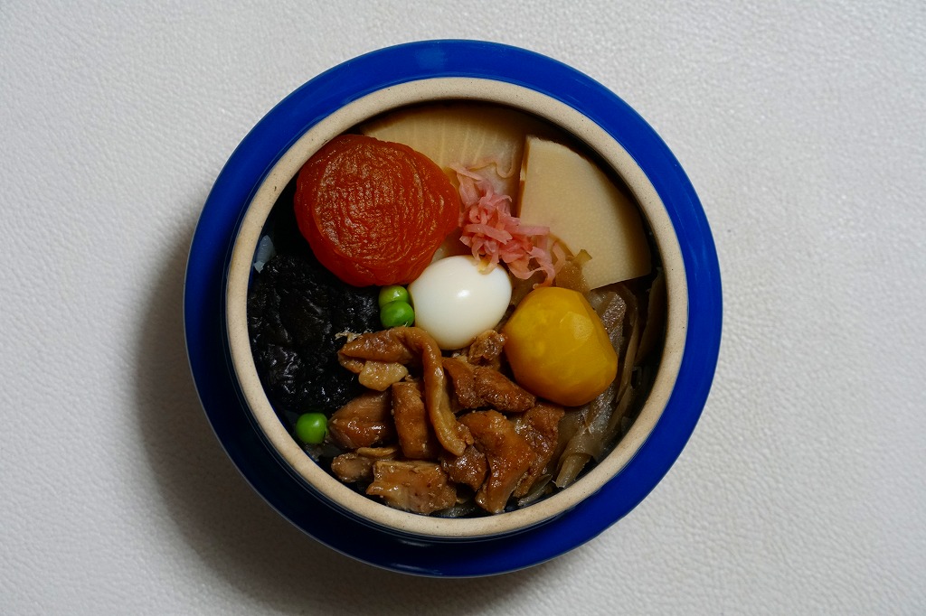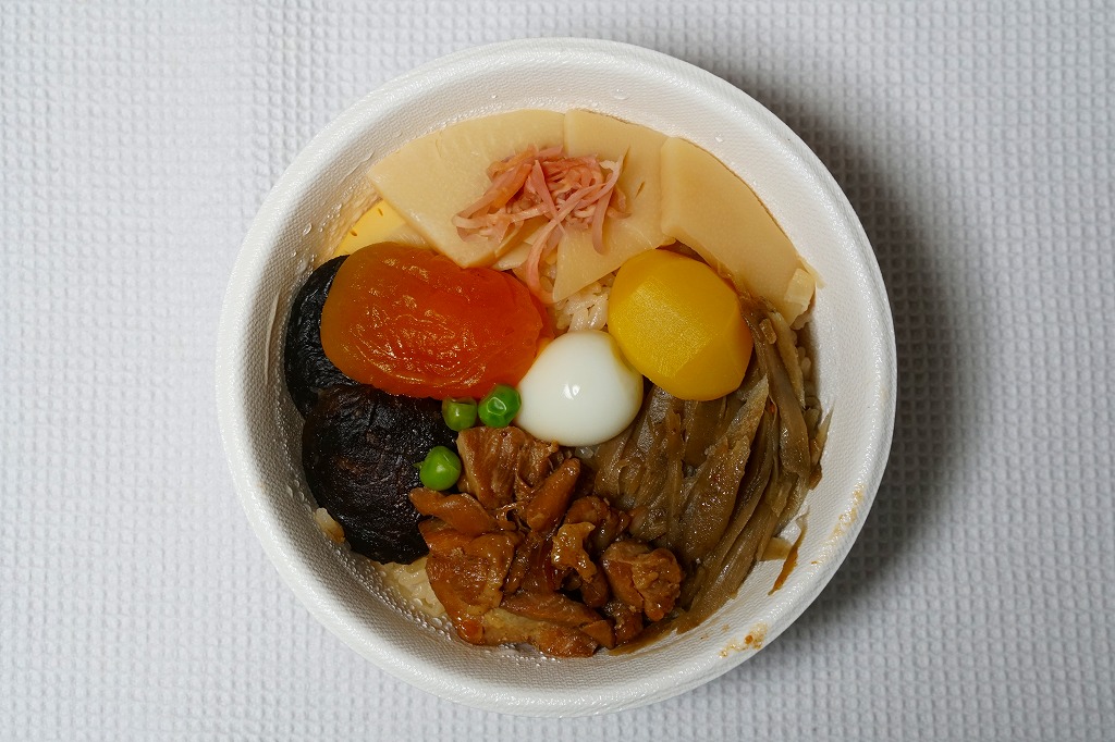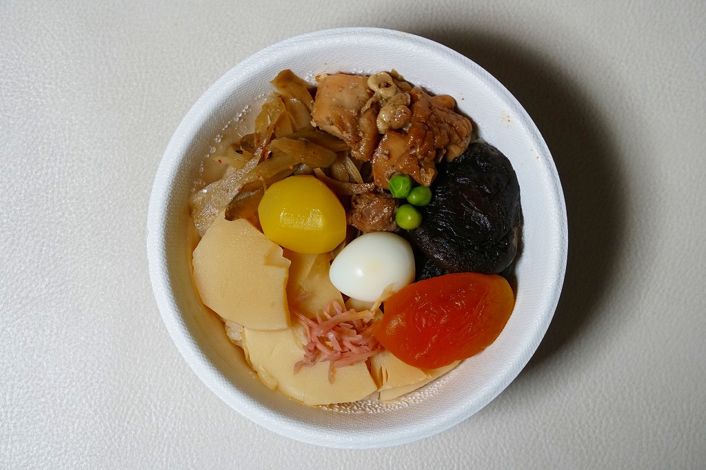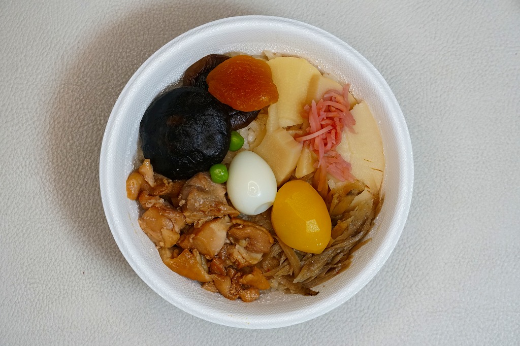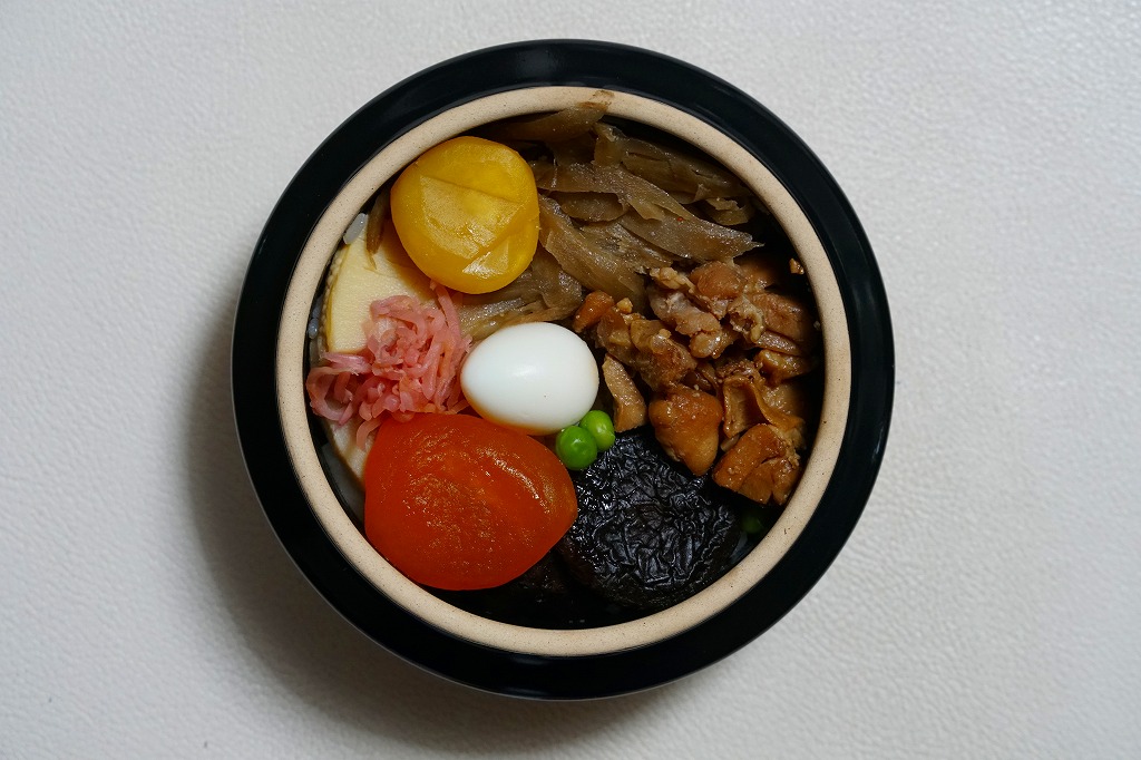 中身は横川のドライブインやサービスエリアで売られる季節の釜飯に似る。イカスミの黒飯を、ローストビーフと、SLの火室の色彩を取り入れたアスパラやパプリカやカブなどの野菜炒めで覆う。普段は漬物を入れるプラ容器には、アンズと煮豆を入れた。温かく暖かい峠の釜めしとは正反対の、クールで明るい味。