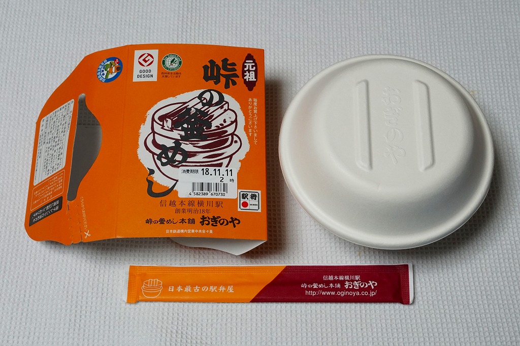 2018(平成30)年11月10日に購入した、横川駅弁のスリーブ。下記の2015年のものと、構造や絵柄は変わらないが、アイコンや注意書きがいろいろ増えている。