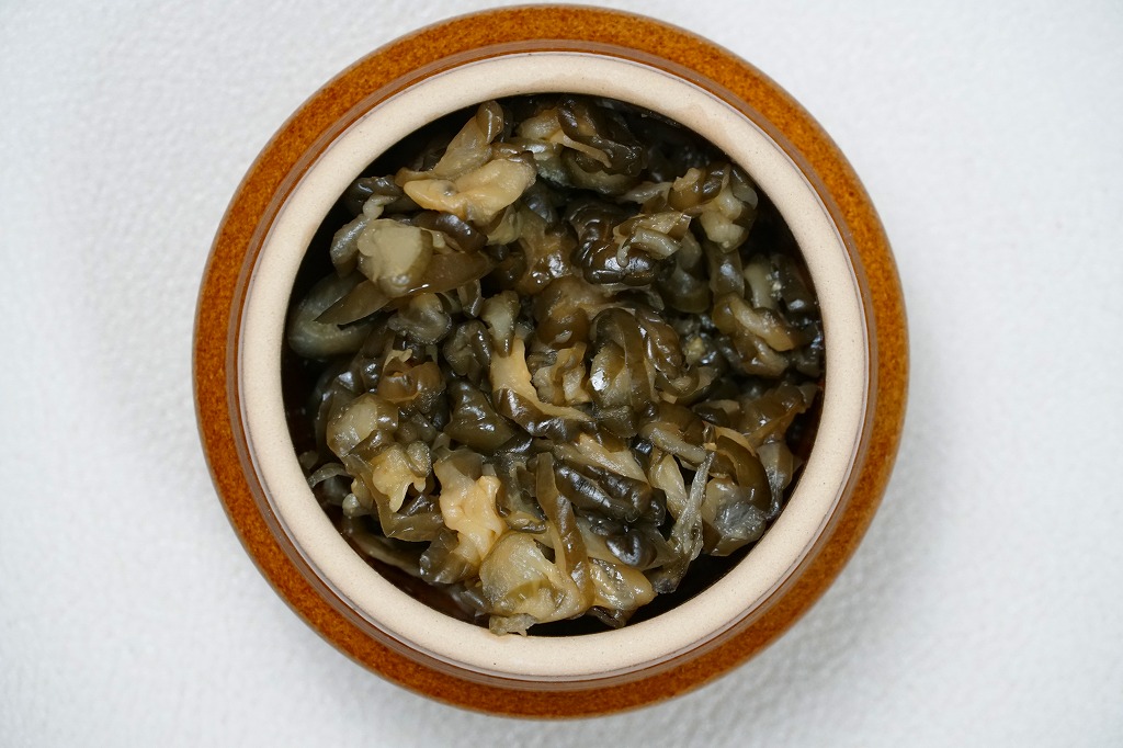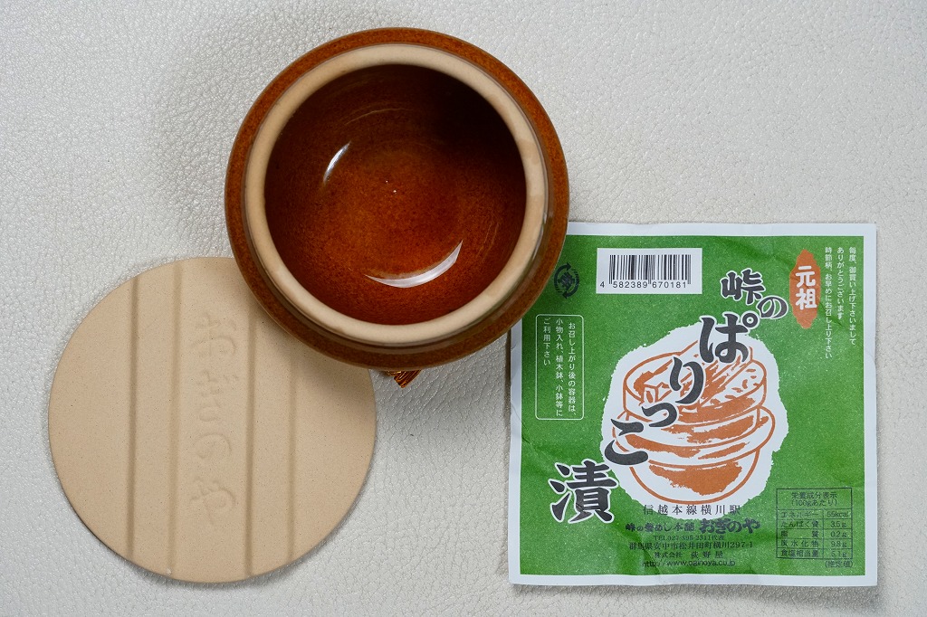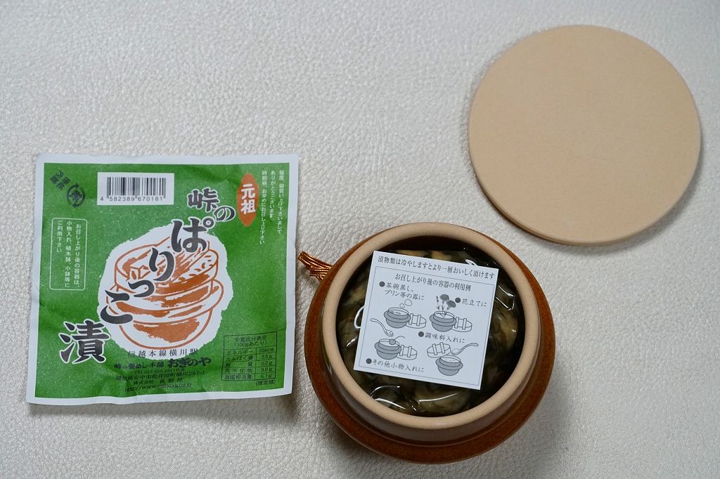 2012(平成24)年か2015(平成27)年までには、調製元のドライブインなどで発売か。横川駅弁「峠の釜めし」の容器を小さくした益子焼に、きゅうり漬けの真空パックを押し込み、峠の釜めしと同じ絵柄で緑色の小さな掛紙をかける。峠の釜めしに添付される香の物5種類のうちひとつである、刻んだキュウリの醤油漬け「峠のぱりっこ漬」の単品販売。土産物店やスーパーでの漬物の袋売りでよいところを、こんな容器に詰めるところがかわいらしい。今回はなんと大阪の駅弁売店で購入。4か月以上の日持ちがする商品とはいえ、そんな遠隔地にもこの漬物のファンがいるということか。