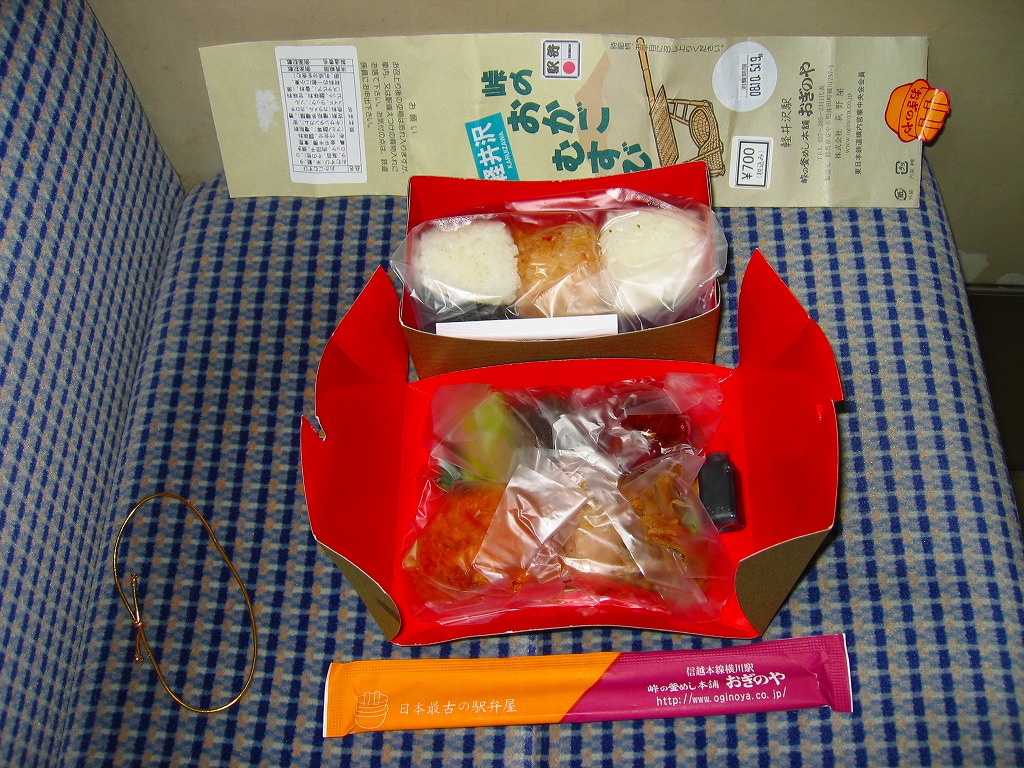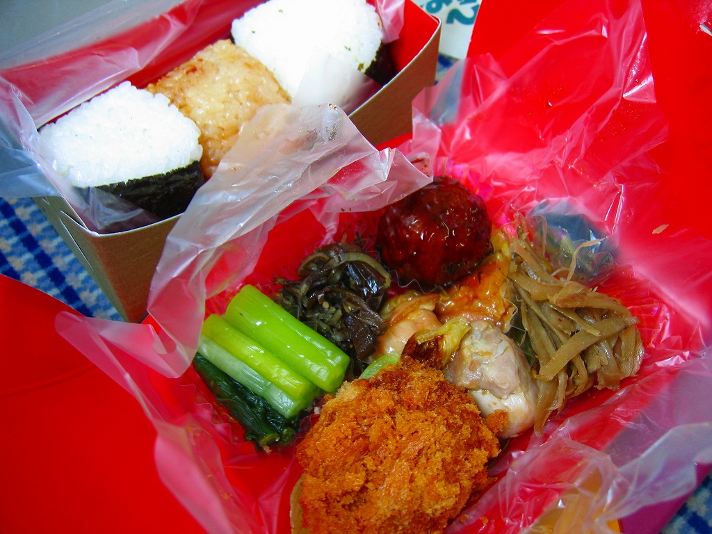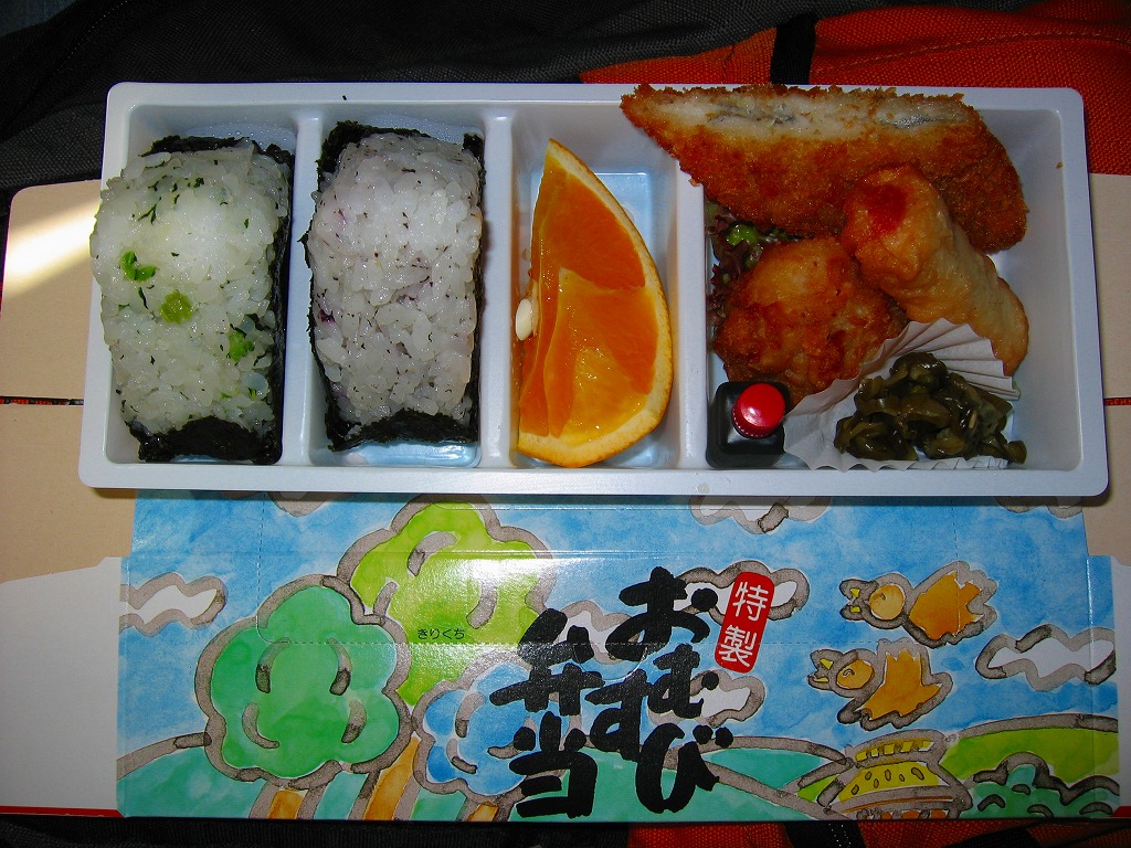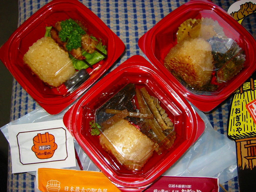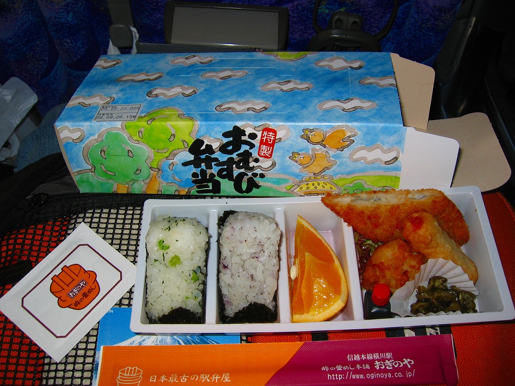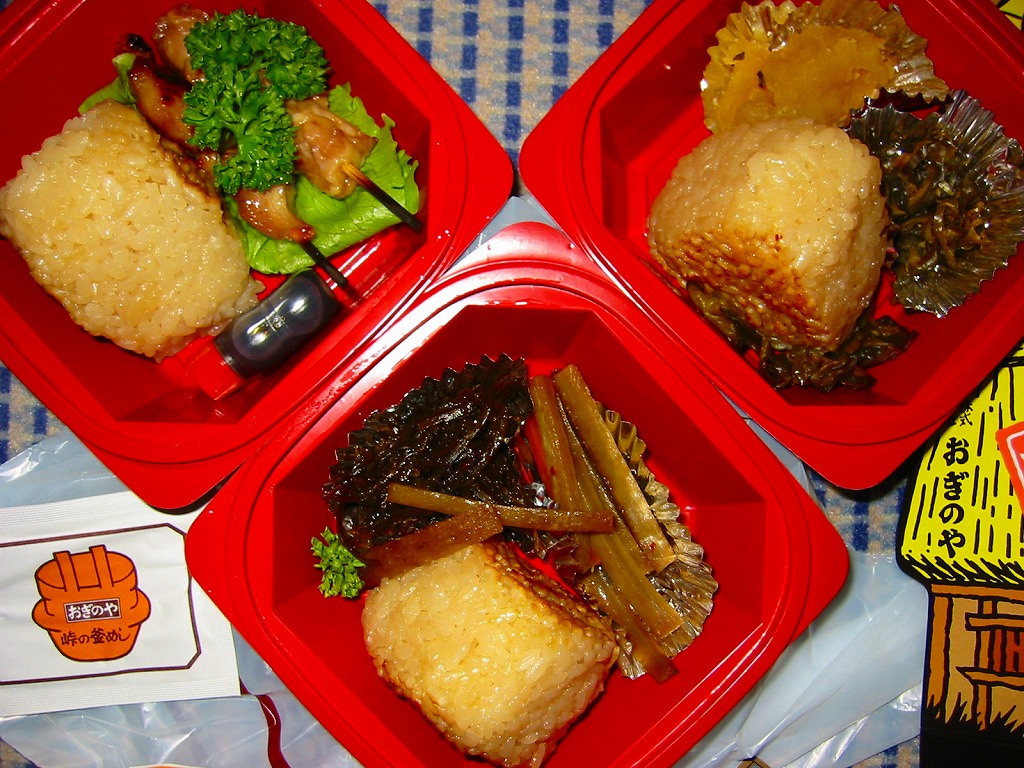 日帰りバスツアーの参加者向けに車内配布された昼食。伊東駅弁「特製おむすび弁当」とまったく同じボール紙箱を使用、中身は高菜むすび、ゆかりむすび、白身魚フライ、鳥唐揚、オレンジなど。味は可もなく不可もなく。駅弁と無縁な弁当であるはずが、調製元が横川駅弁の荻野屋で、割りばしとおてふきとビニール袋が「峠の釜めし」と同一であり、「日本最古の駅弁屋」や「信越本線横川駅」をうたっている。なお、積込場所の上信越自動車道諏訪湖サービスエリアに弁当販売はなかった。