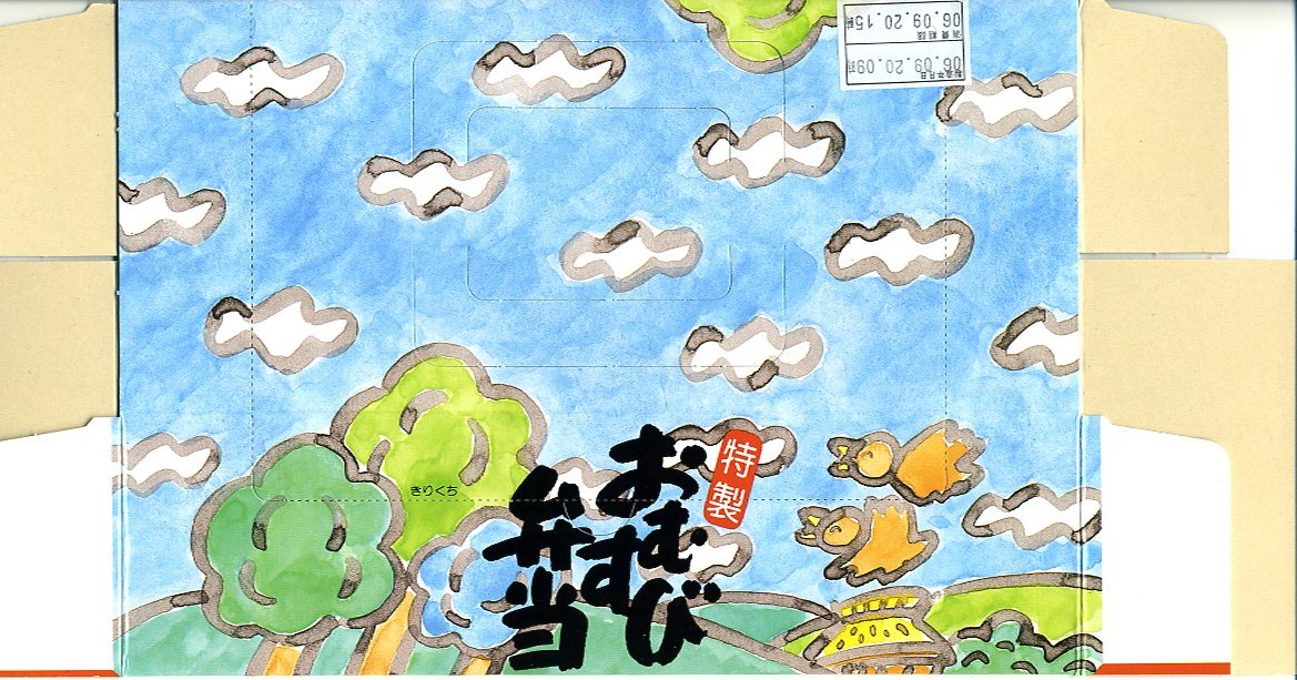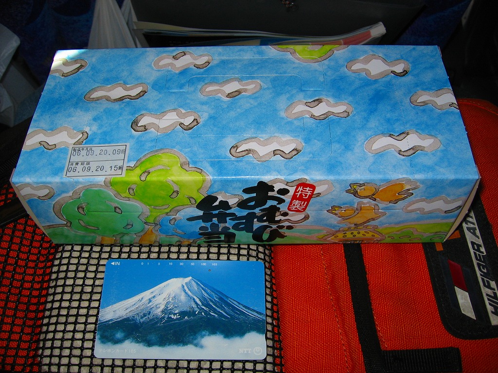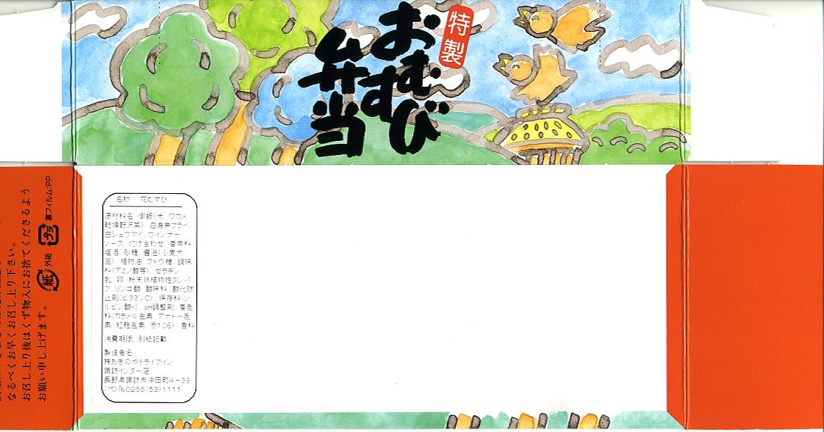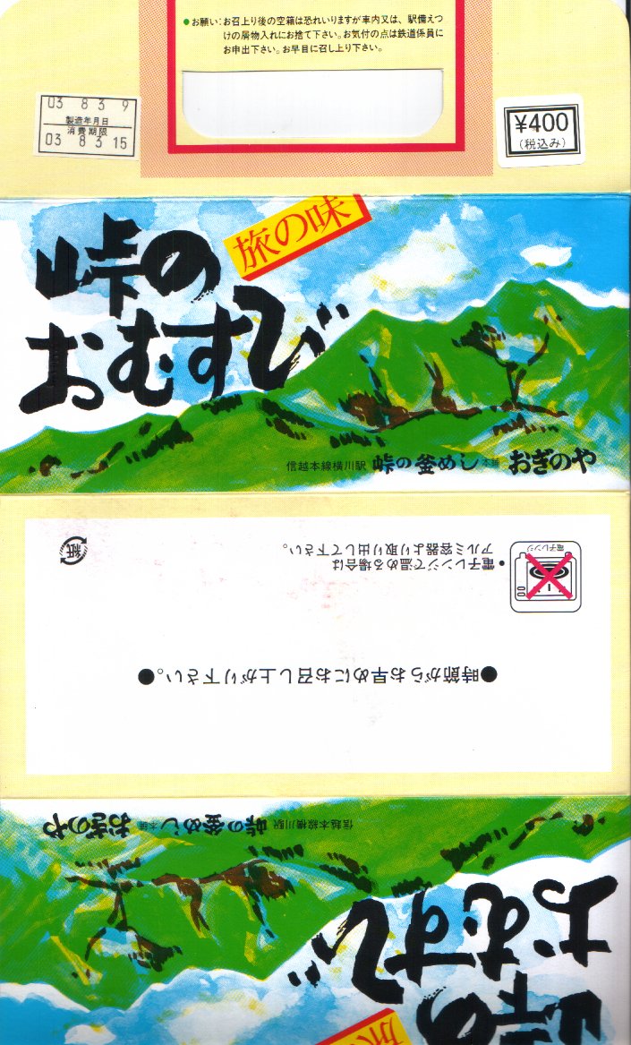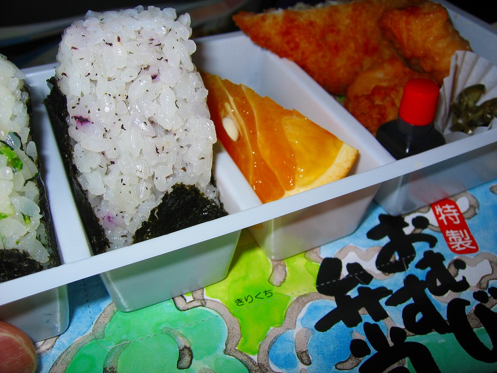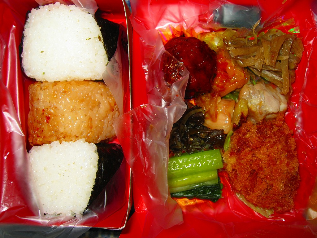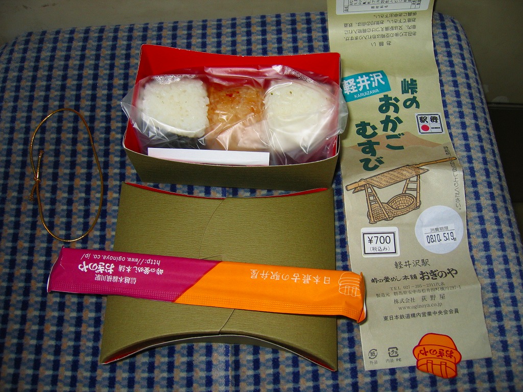 日帰りバスツアーの参加者向けに車内配布された昼食。伊東駅弁「特製おむすび弁当」とまったく同じボール紙箱を使用、中身は高菜むすび、ゆかりむすび、白身魚フライ、鳥唐揚、オレンジなど。味は可もなく不可もなく。駅弁と無縁な弁当であるはずが、調製元が横川駅弁の荻野屋で、割りばしとおてふきとビニール袋が「峠の釜めし」と同一であり、「日本最古の駅弁屋」や「信越本線横川駅」をうたっている。なお、積込場所の上信越自動車道諏訪湖サービスエリアに弁当販売はなかった。