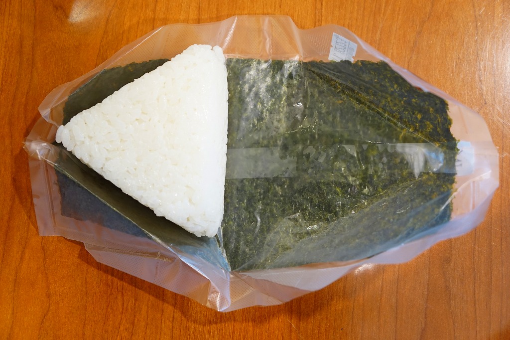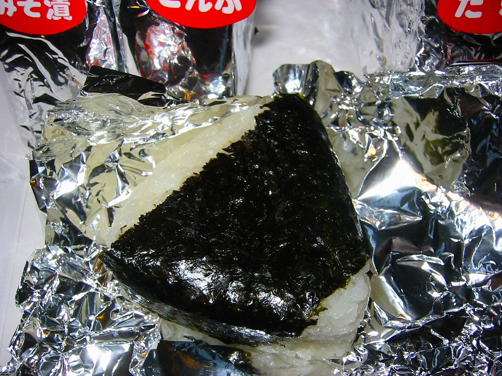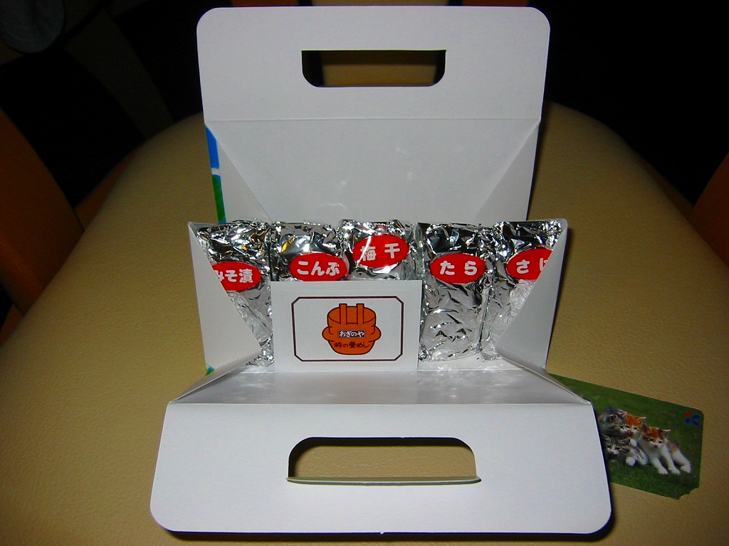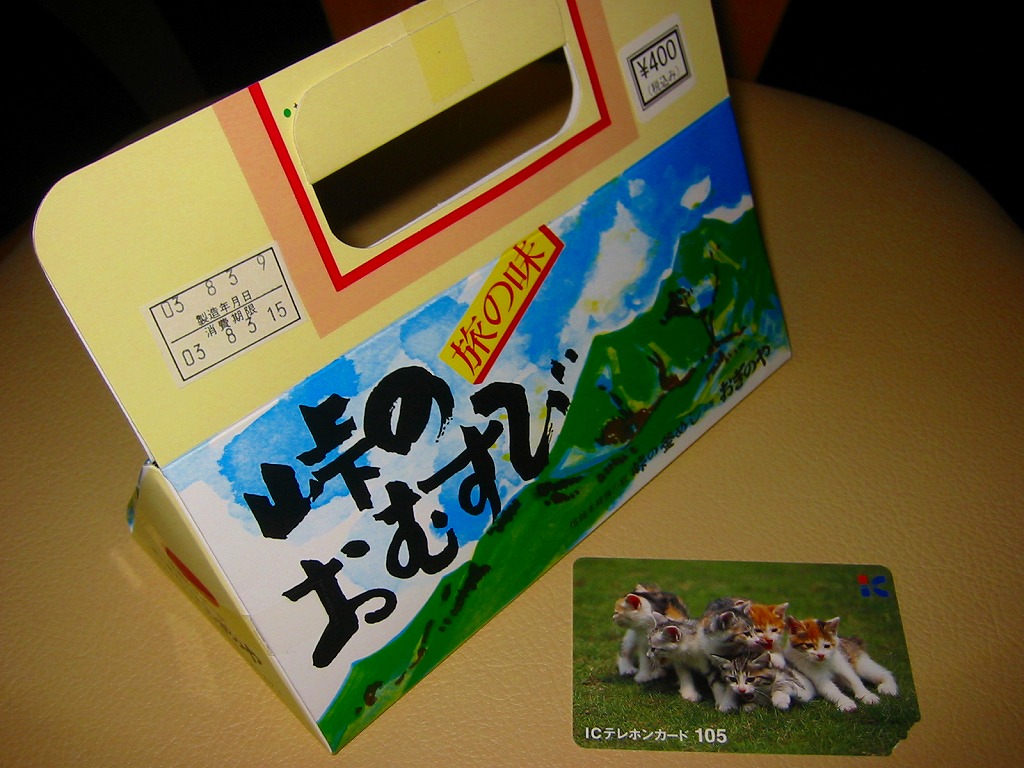 ボール紙を三角形に組み立てて容器とする。中身は写真のとおり、みそ漬・こんぶ・梅干・たら・さけが入ったおむすびが各1個ずつ、アルミホイルに包まれて収められている。味は良好。400円で満腹になるお得な駅弁だが、理由は販売の個数か頻度か時間帯か、ふらりと立ち寄っただけではまず入手できない印象だった。2007年現在でなくなっている模様。