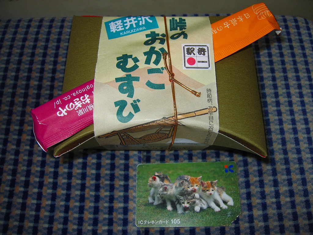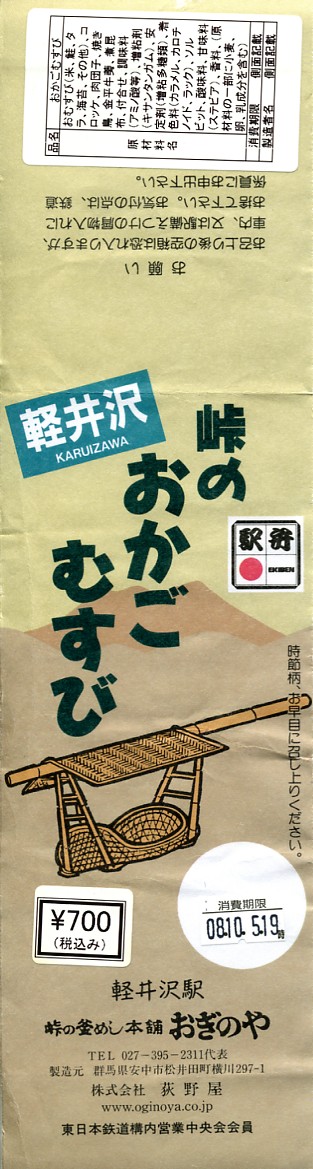 抹茶色のボール紙を立体的かつ巧みに組み立てた容器に、商品名やカゴなどを描いた紙帯を締める。中身は二段構造で、下段に鮭、タラ、焼きの小さなおむすびを各1個、上段にコロッケ、肉団子、焼き鳥、きんぴら、煮昆布、付合せを詰める。もともと軽井沢駅の駅弁だったそうで、その名残りが掛紙に残る。車中では食べにくい自宅向け商品。米と鳥の風味はいけてるが、価格は割高。2010年頃から、おそらく現存しない。
