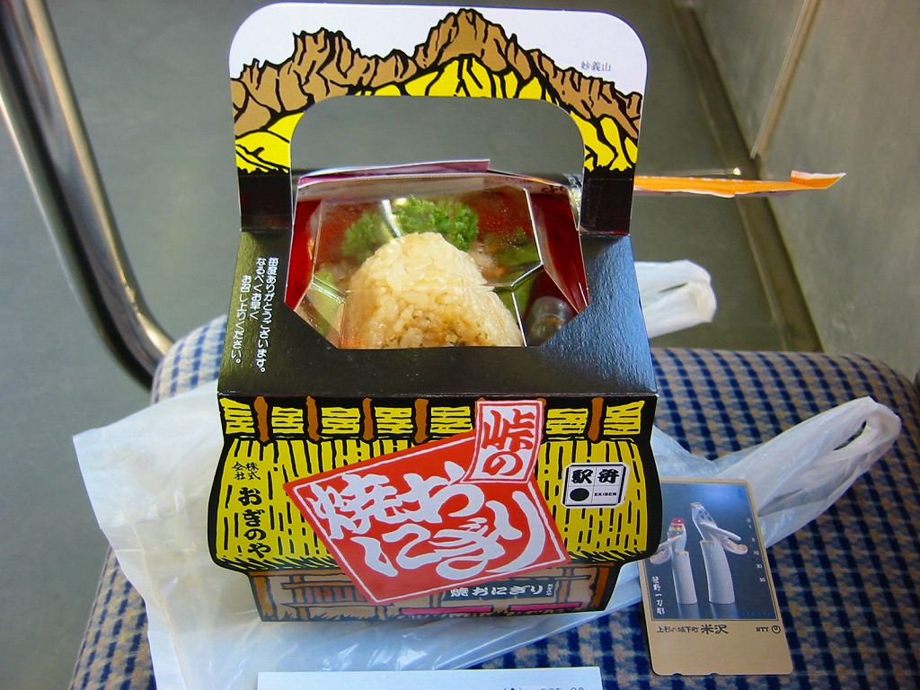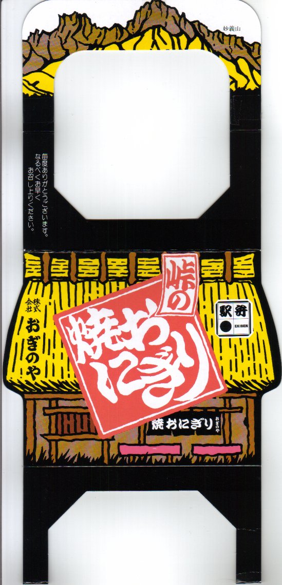 JR東日本の観光キャンペーン「LOOK EAST」のオリジナル駅弁131種類のひとつとして、1989(平成元)年3月に発売か。プラスティックのミニ容器が三段重ねになり、ボール紙の枠にしっかりはめられる。中身はその容器のそれぞれに、小柄な焼きおにぎりがひとつずつに、串焼鳥やきんぴらごぼうや煮昆布などが添えられているもので、いずれも香りが良く味もなかなか。駅弁大会に持ってきても喜ばれるのではと思うが、製造数が少ないのか、現地でも滅多にお目にかかれない模様。2010年頃から、おそらく現存しない。