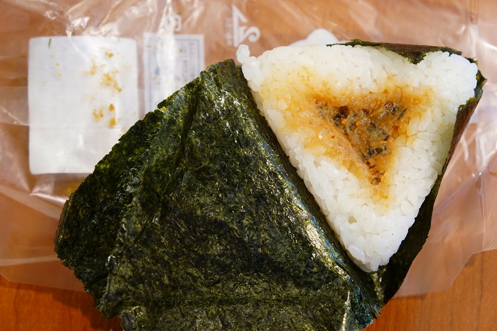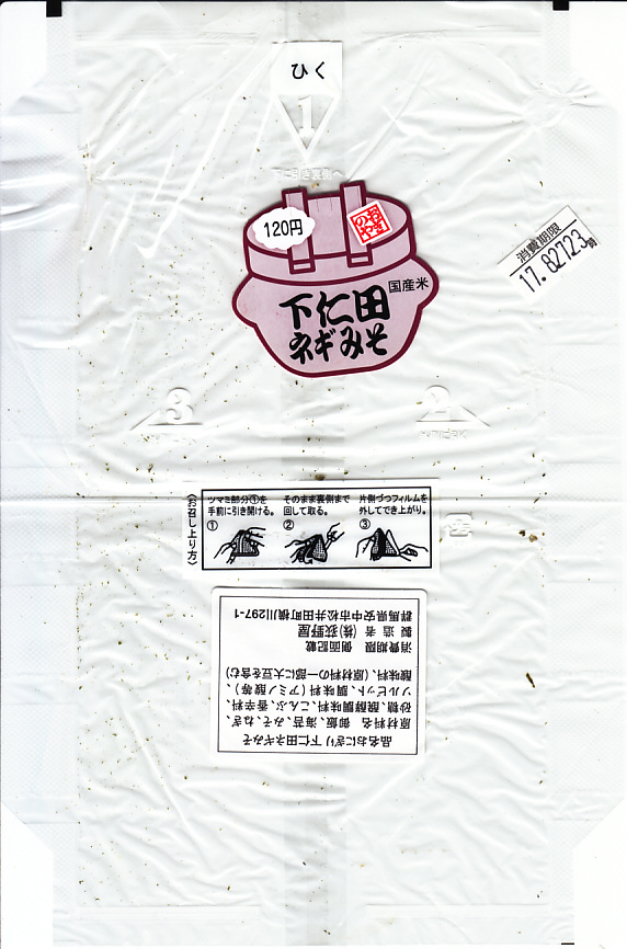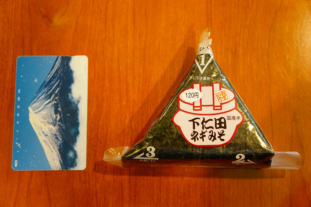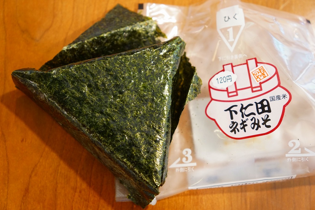 上信越自動車道の横川サービスエリアで買えたおにぎり。調製元は横川駅の駅弁屋。でもここまでくると、駅弁に準じた商品というよりはむしろ、ただのコンビニおにぎり。今回はわざと開いてみたが、つまみをひくと簡単に開く、全国共通のコンビニおにぎり向け包装をした、ネギ味噌入りおにぎり。包装の絵柄には一応、釜めしの容器のようなものが使われていた。