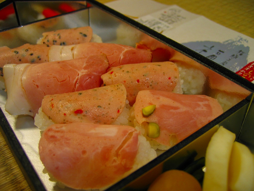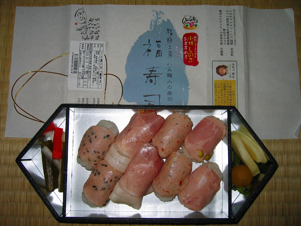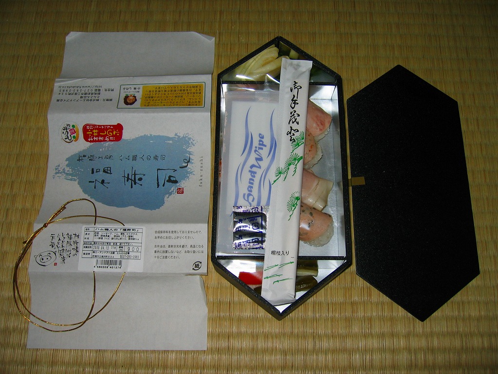 速弁のNEXCO東日本版「どら弁当」のシリーズ第4弾として、2007(平成19)年12月22日に上里サービスエリアで発売。個性的な黒い六角形の容器に、商品名やロゴマークなどを描いた掛紙を巻いて、ゴムでしばる。中身はハムやソーセージのにぎり寿司が8個と、付合せの漬物が少々。