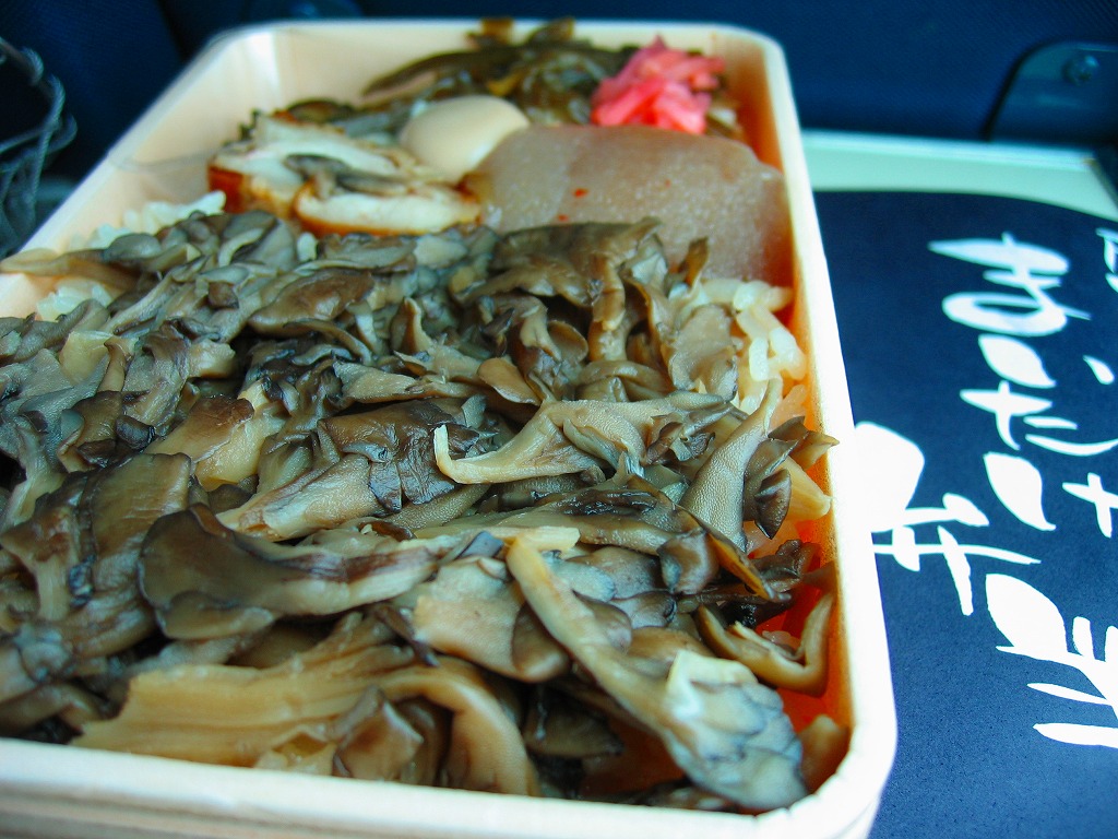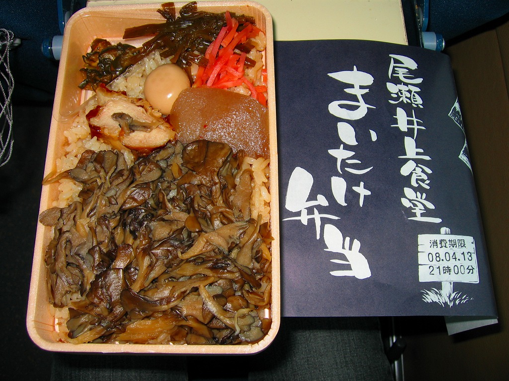 中身はマイタケの混ぜ茶飯の上にマイタケをたっぷり、こんにゃくと鶏照焼スライスとうずらの卵を1つずつ載せ、紅生姜やわさび茎などの付合せを添えるもの。水気豊かな御飯も大量のマイタケも、濃い色なのに味付けはあっさり。他の具のアクセントも含め、バスや自宅で食べると惣菜に毛が生えた程度の風味で、緑の中で食べると爽やかさが一杯に広がりそう。