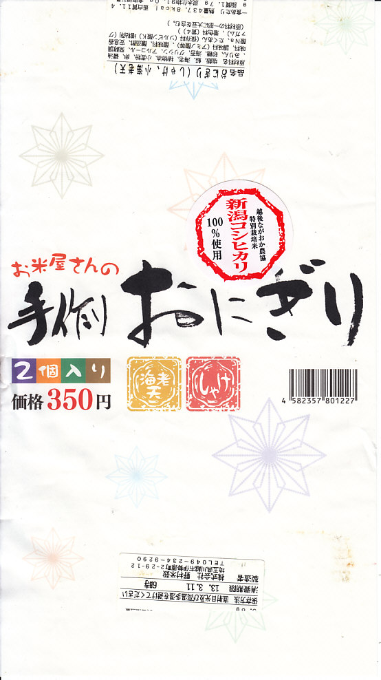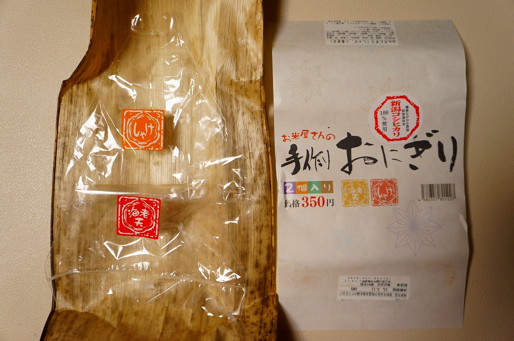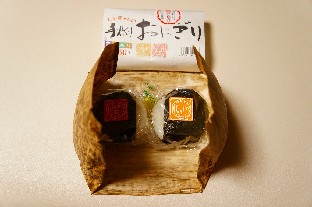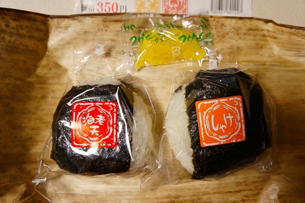 竹皮に直巻きタイプのコンビニおにぎりをふたつ(海老天、しゃけ)包んで、商品名を書いた掛紙を巻いて350円。海老天を飯の中に入れたおにぎりは珍しいなと思ったが、それ以上の感想が出ない、特徴に薄い商品。食品表示ラベル記載の電話番号のネット検索結果と製造者名が一致しないのは、なぜだろう。