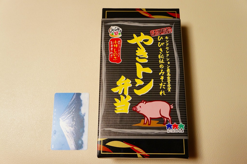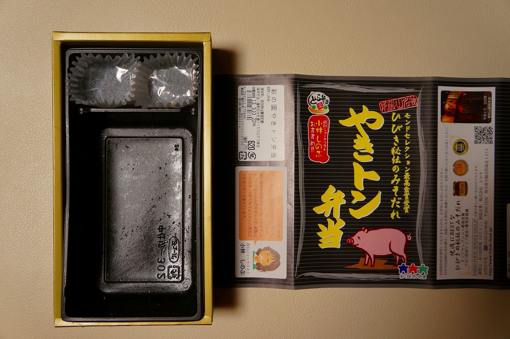 長方形の容器に白御飯を敷き、豚そぼろ、焼き鳥サイズの豚肉、細かいきんぴらごぼう、ネギ、しいたけ、小松菜で覆い、玉こんにゃくと芋ようかんを添えるもの。主役の豚肉は脂肪がギシギシ歯に引っかかる感じでうまくなく、秘伝のみそだれやそのピリ辛風味は、特に感じなかったような。980円の駅弁と容器やつくりは同じなのに、肉の違いを考えても風味がまるで違うのは、価格の差だろうか。価格は2013年の購入時で620円、2014年4月の消費税率改定で638円。