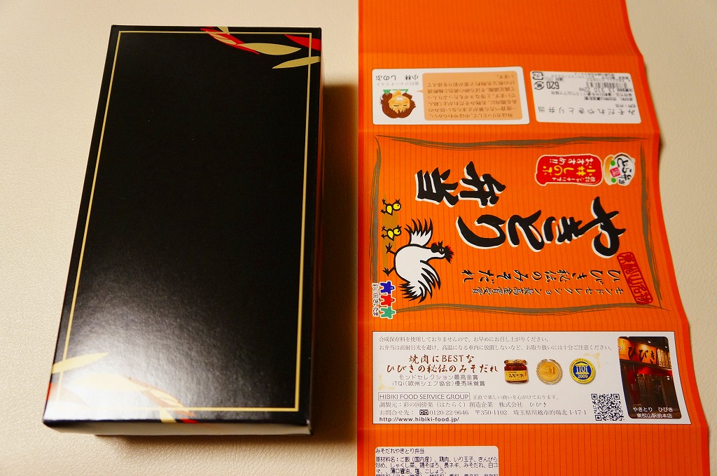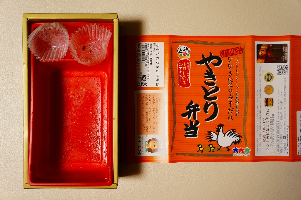 上の「やきトン弁当」と同じ容器に白御飯を敷き、焼き鳥サイズの鶏肉、炒り卵、ネギを載せて、しゃくし菜漬けと細かいきんぴらごぼうを添えるもの。主役の鶏肉は身がザラザラするもサクサクな歯応えに特徴があり、秘伝のみそだれやそのピリ辛風味は、特に感じなかったような。価格は2013年の購入時で620円、2014年4月の消費税率改定で638円。