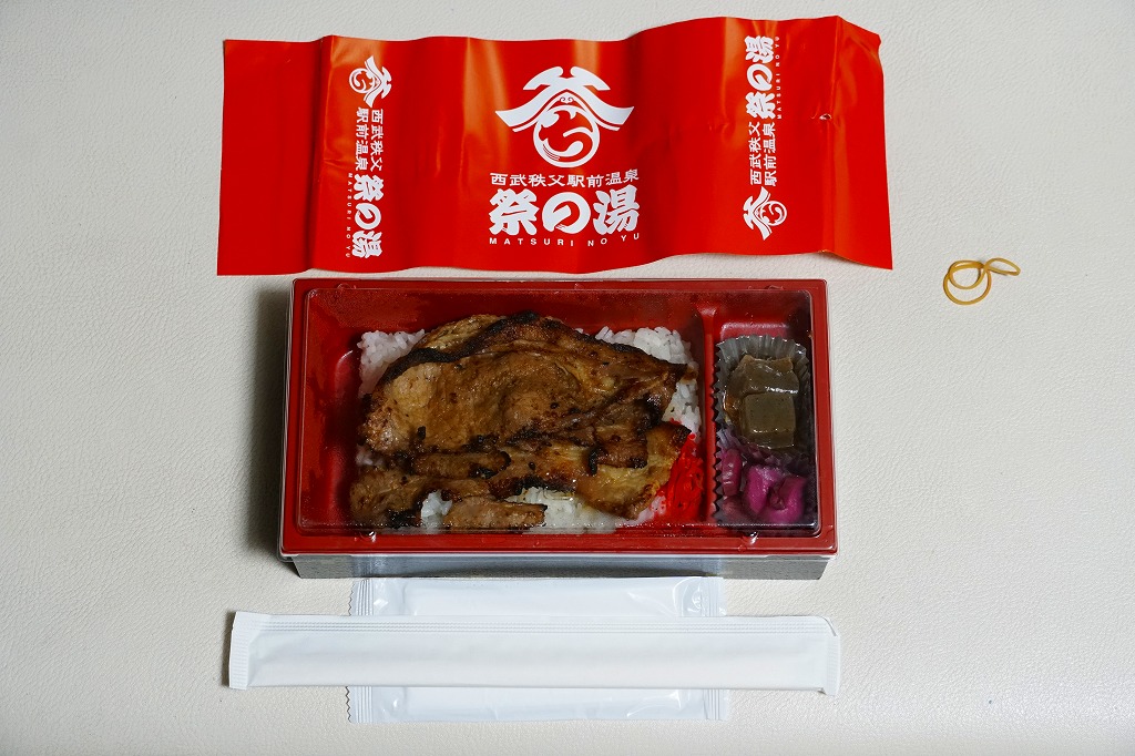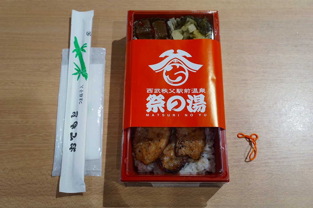 上記の弁当「祭の湯(秩父名物わらじかつ弁当)」と同じく、駅の温浴施設「祭の湯」のフードコートで買える弁当。食券販売機は共通だが、注文カウンターは異なるという不思議な売り方。中身はわらじかつが炙り豚味噌に変わっただけで、掛紙も容器もその他の具も価格も同じ。炙り豚味噌というよりはベーコン状の焼豚がカリカリして、こちらは食べておいしい焼豚丼。価格は2018年時点で950円、2019年10月時点で970円、2023年時点で1,090円。