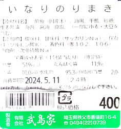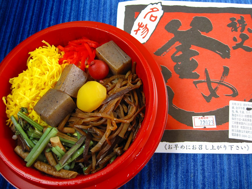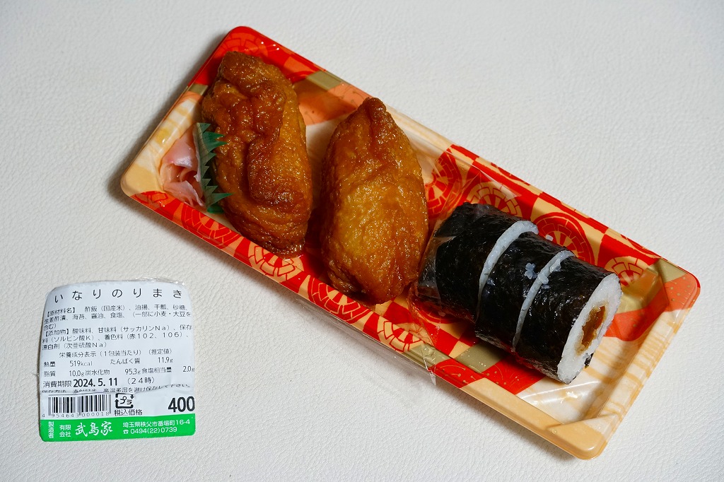 2024年に西武秩父駅で購入。いなりずし2個と、細巻きより太いかんぴょう巻3個。つまり、お惣菜。このように西武秩父駅では、改装で2016年に釜飯やわらじかつ弁当のような駅弁が消え、改装後に外観はともかく中身はわらじかつやおにぎりや幕の内だった弁当も消え、売店から駅弁がなくなってしまった。調製元は秩父市街で大正時代から続くいなりずしとのりまきの専門店であり、これはまだ地元の商品ではあるが、広域配送のコンビニ向け惣菜工場に替わるのも時間の問題か。