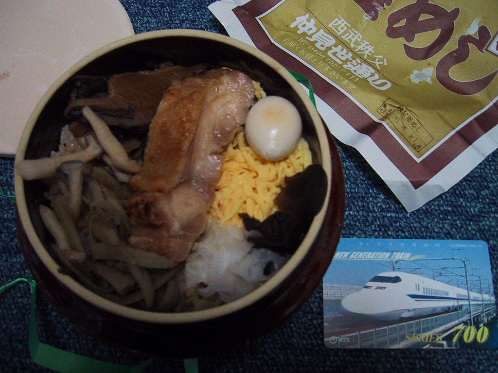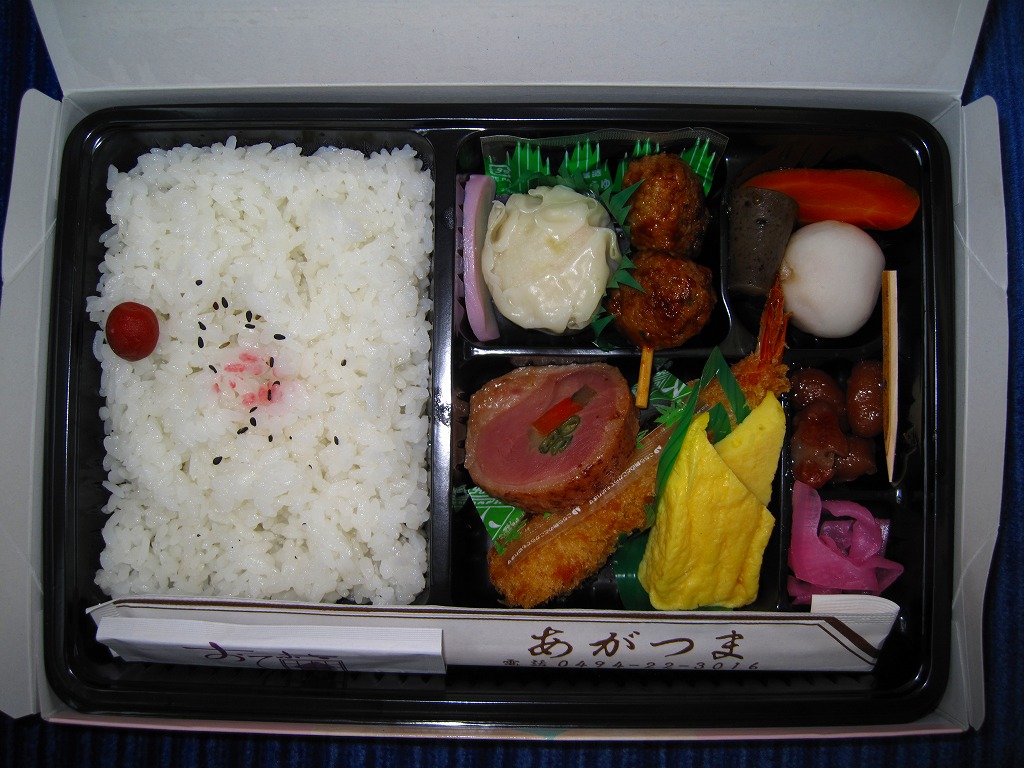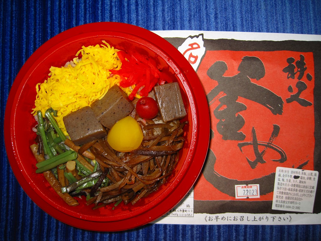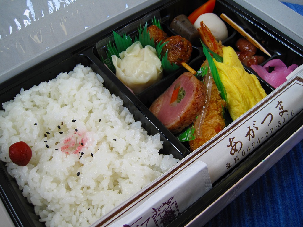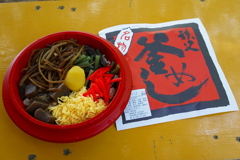 西武秩父駅の幕の内駅弁。中身は日の丸御飯にエビフライ、鶏肉巻、玉子焼、肉団子、しゅうまい、極薄なかまぼこ、こんにゃくなどの煮物、金時豆など。市販のボール紙製長方形の容器をそのまま使う外観も、黒いトレーに入った中身の風味も、まるっきり惣菜弁当。「秩父釜めし」と同じ売店で売られるが、釜飯とは調製元は異なる。価格は2000年代で700円、2014年4月の消費税率改定で720円。2024年に来てみたら、売店での弁当の販売がなくなっていた。