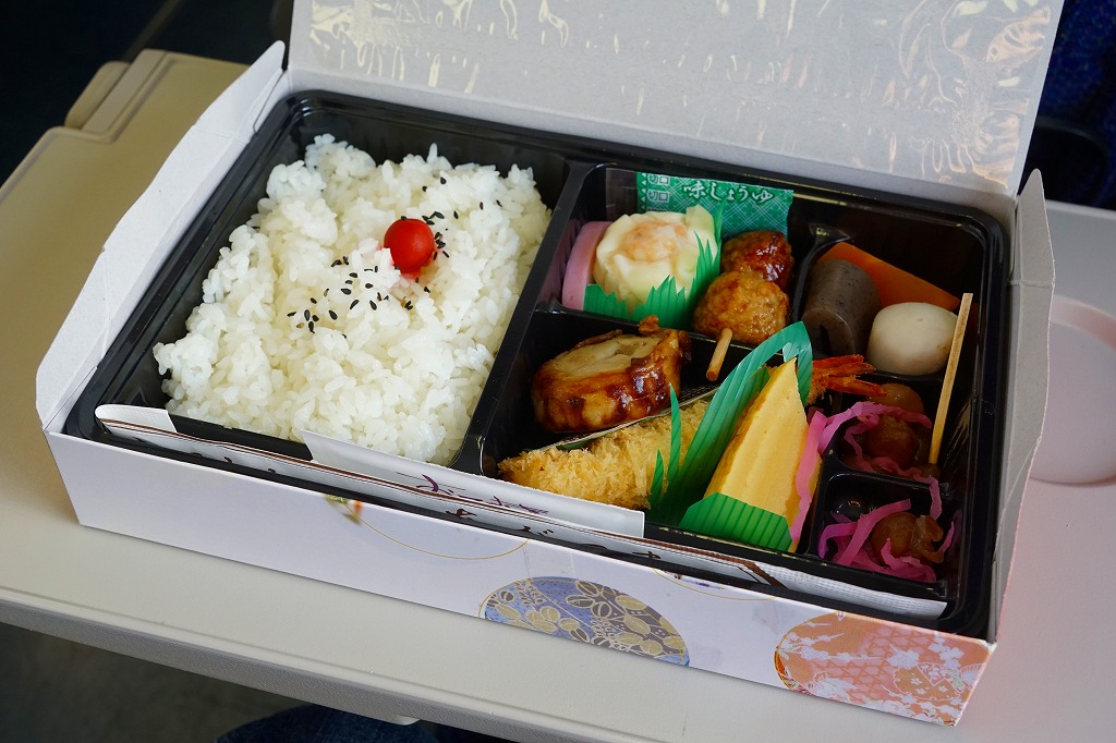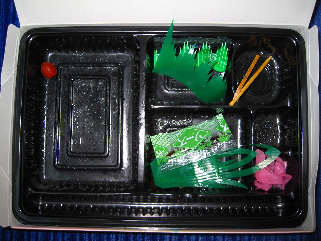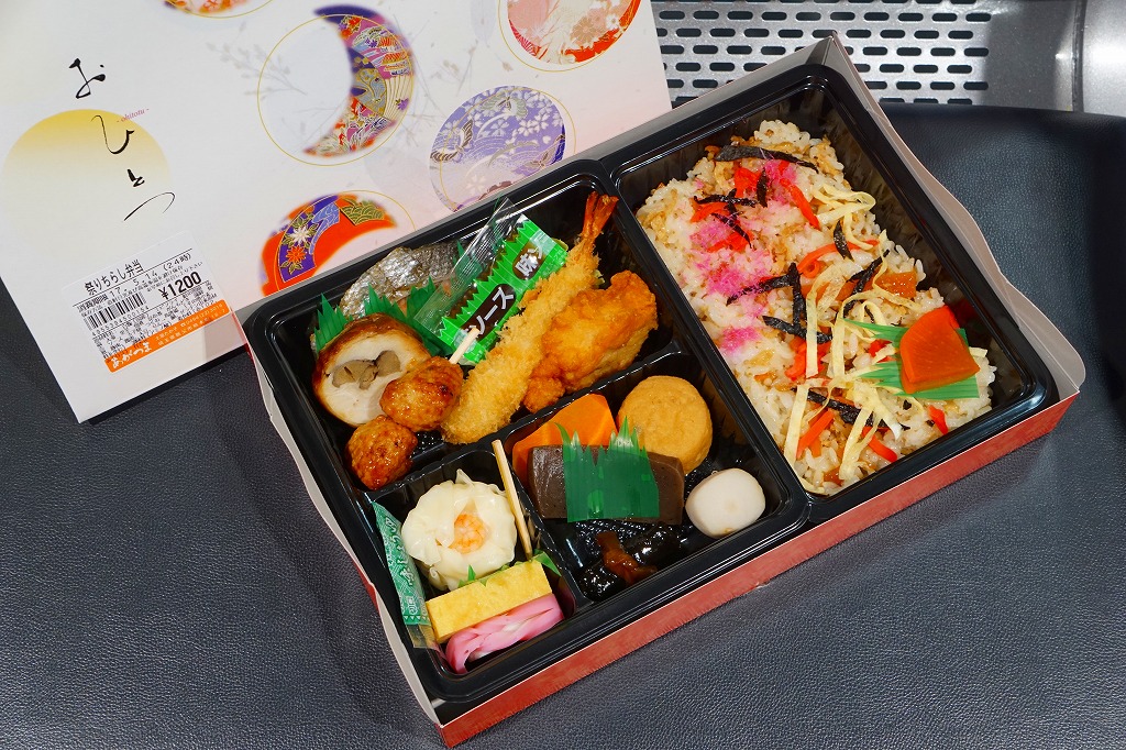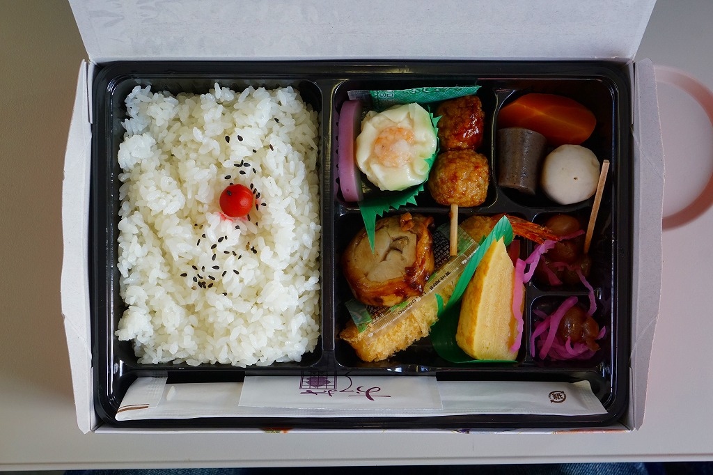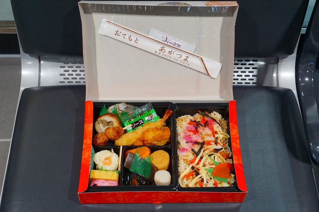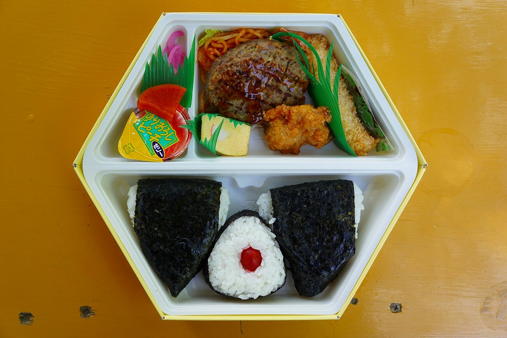 西武秩父駅の幕の内駅弁。中身は日の丸御飯にエビフライ、鶏肉巻、玉子焼、肉団子、しゅうまい、極薄なかまぼこ、こんにゃくなどの煮物、金時豆など。市販のボール紙製長方形の容器をそのまま使う外観も、黒いトレーに入った中身の風味も、まるっきり惣菜弁当。「秩父釜めし」と同じ売店で売られるが、釜飯とは調製元は異なる。価格は2000年代で700円、2014年4月の消費税率改定で720円。2024年に来てみたら、売店での弁当の販売がなくなっていた。